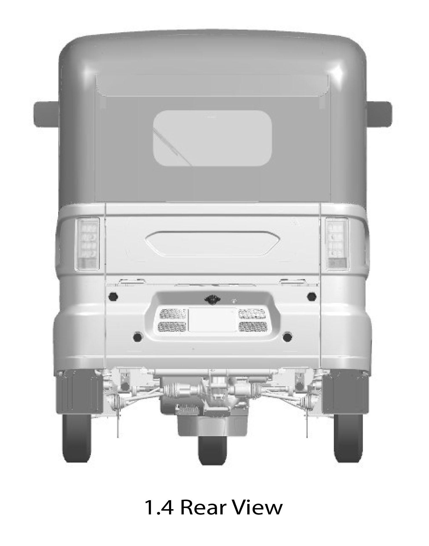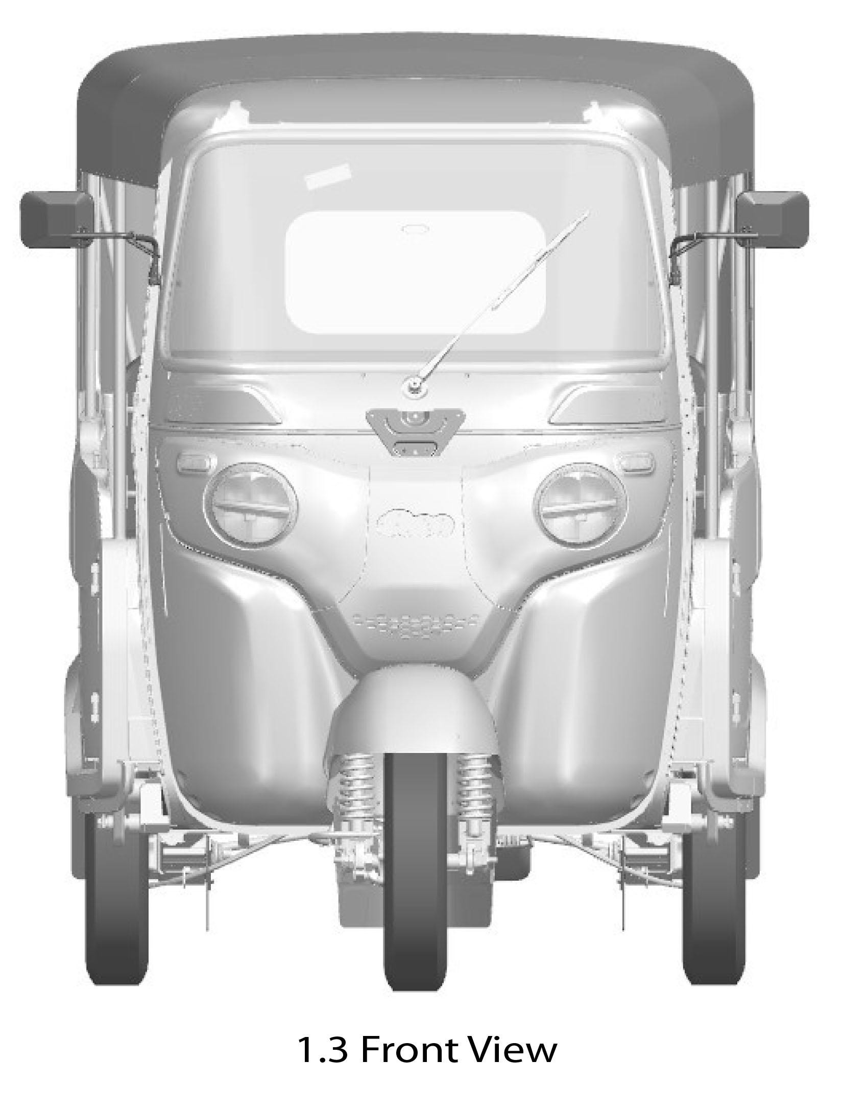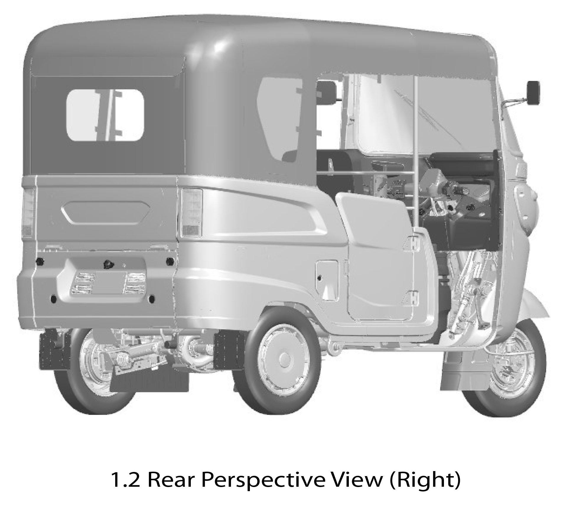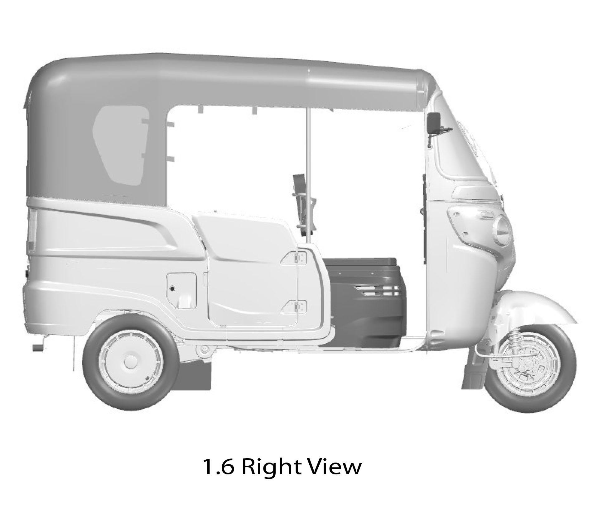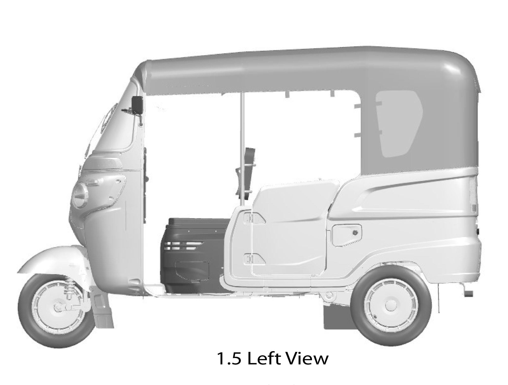 The three-wheeled vehicle is modern, aerodynamically designed passenger auto-rickshaw. The vehicle cabin includes a front driver seat and a rear bench seat for passengers, equipped with lockable sculpted passenger side doors and covered by a roof canopy having transparent windows at vehicle rear and both sides. A dashboard integrates steering unit and control switches. A front panel includes oval headlamp housed within a front cover having distinctly protruding snout above a front wheel. Wide windshield and dual side mirrors enhance front visibility. Winglets at side and rear panels symbolize agility. Both rear wheels enclosed in rounded fenders, giving robust appearance.