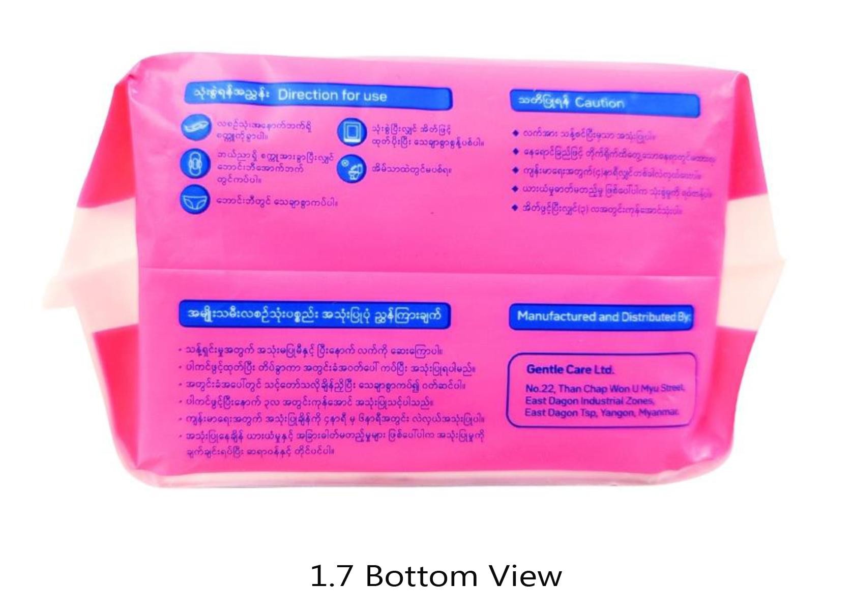 Sanitary Pad ၏ ထုပ်ပိုးမှုဒီဇိုင်းကိုလျှောက်ထားခြင်းဖြစ်ပါသည်။ စက်မှုဒီဇိုင်းတွင်ပါရှိသော စာသားများ၊ စကားလုံးများ၊ ကိန်းဂဏန်းများ၊ သင်္ကေတများ၊ Barcode များကို တစ်ဦးတည်းအသုံးပြုမှုနှင့် စပ်လျဉ်းသည့်အခွင့်အရေးကို တောင်းဆိုမှုမရှိကြောင်း တင်ပြအပ်ပါသည်။