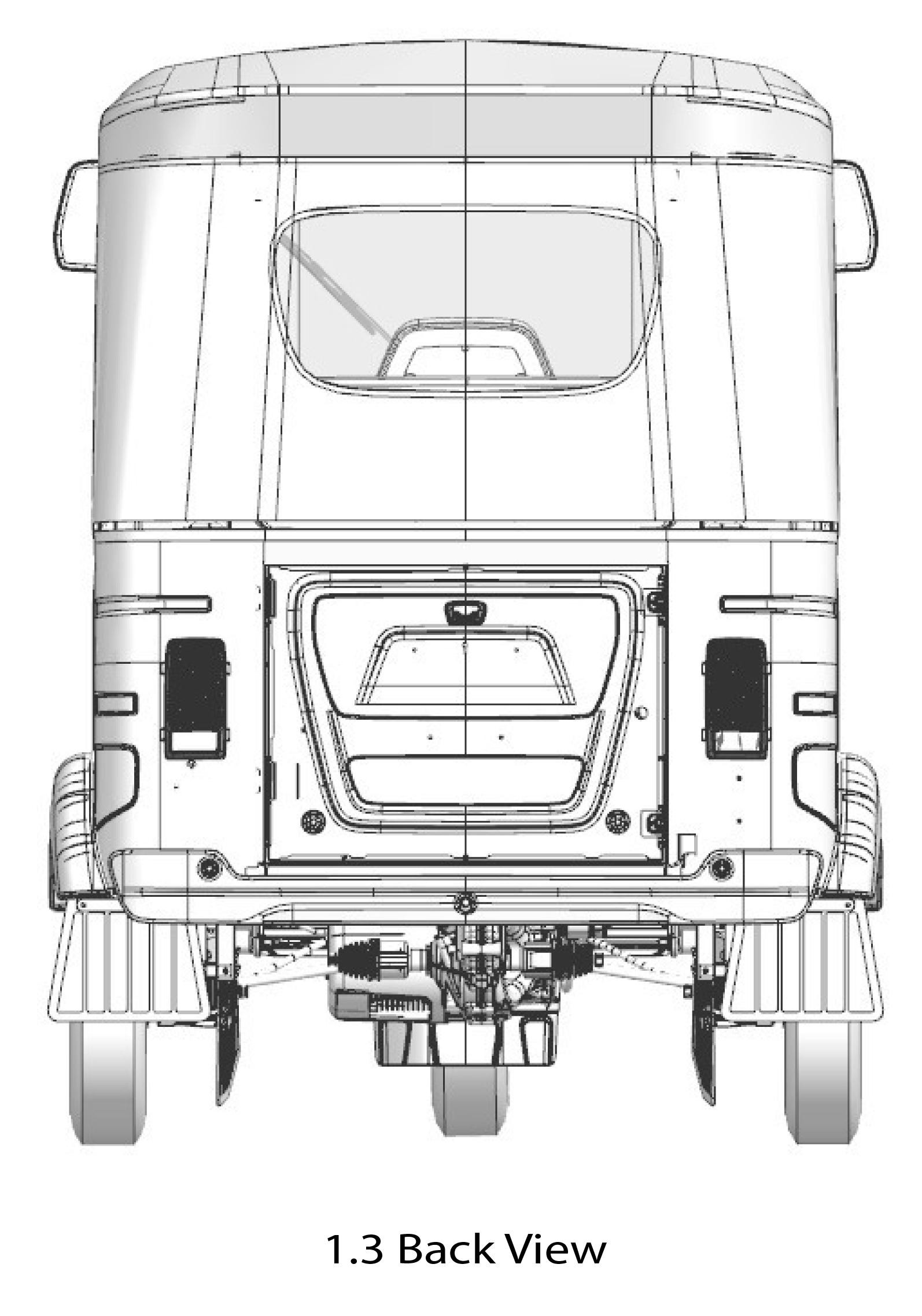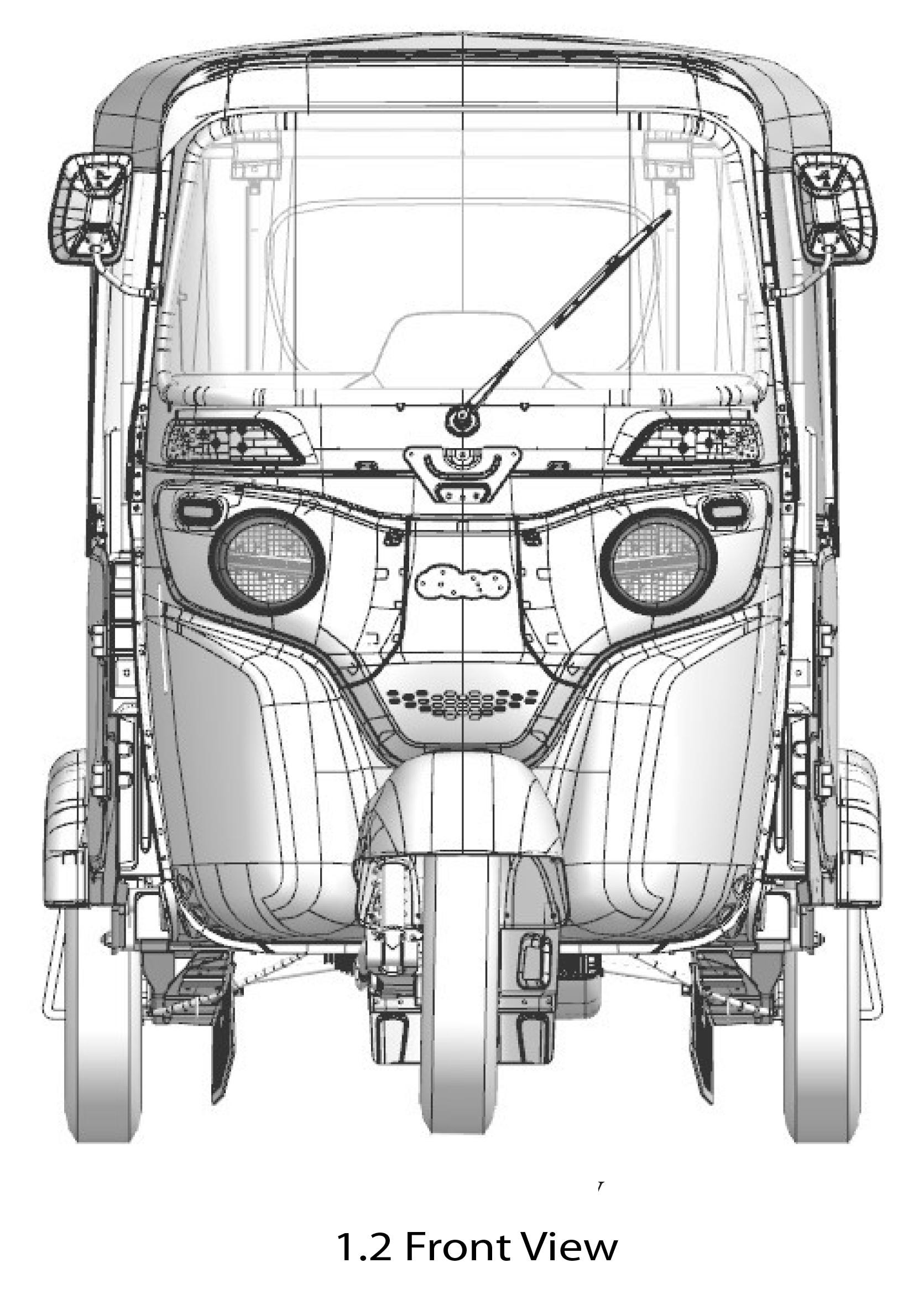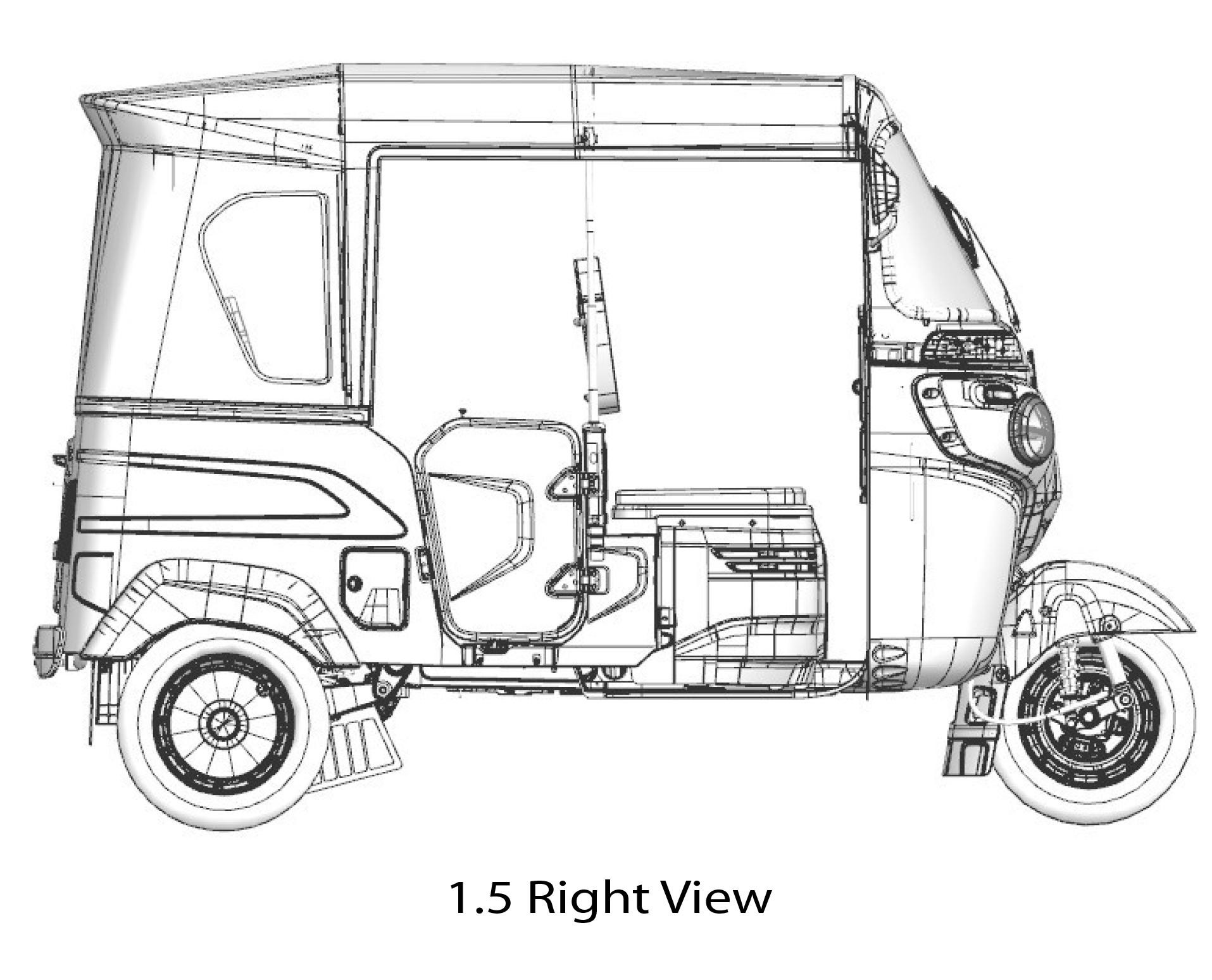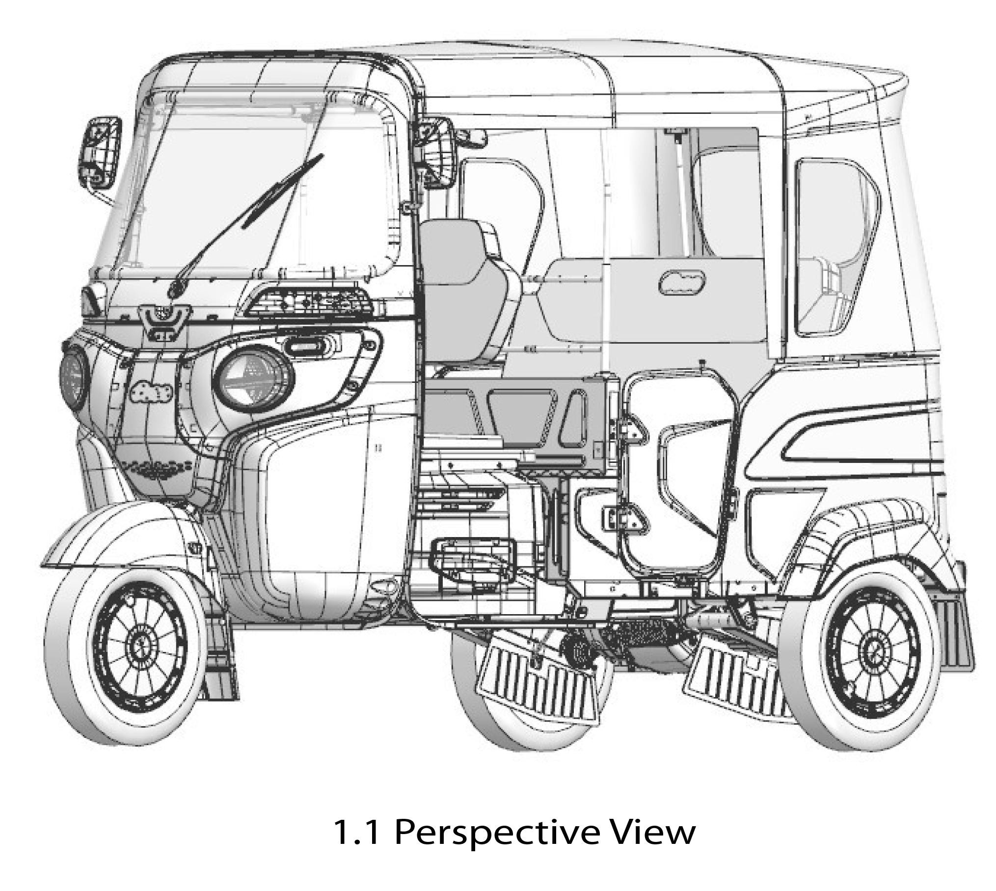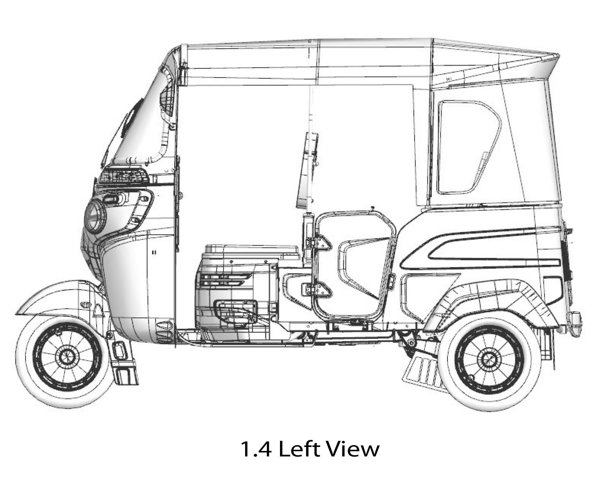 The three-wheeled vehicle is modern, aerodynamically designed passenger auto-rickshaw. The vehicle cabin includes a front driver seat and a rear bench seat for passengers, equipped with lockable sculpted passenger side doors and covered by a roof canopy having transparent windows at vehicle rear and both sides. A dashboard integrates steering unit and control switches. A front panel includes oval headlamp housed within a front cover having distinctly protruding snout above a front wheel. Wide windshield and dual side mirrors enhance front visibility. Winglets at side and rear panels symbolize agility. Both rear wheels enclosed in rounded fenders, giving robust appearance.