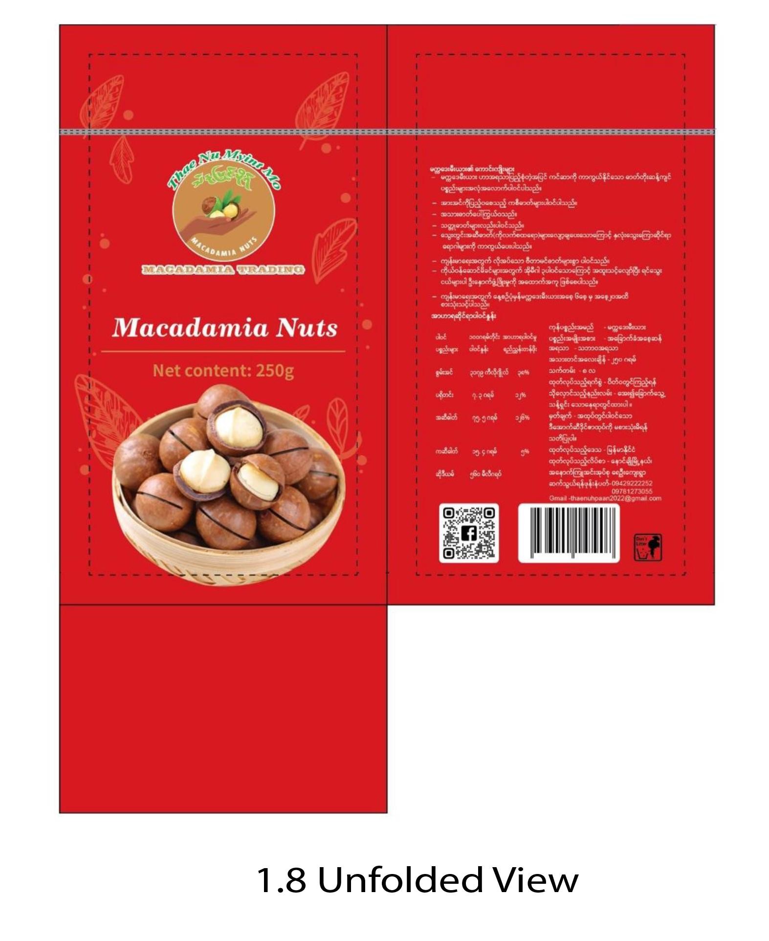 Macadamia Nuts ၏ထုပ်ပိုးမှုဒီဇိုင်းကို လျှောက်ထားခြင်းဖြစ်ပါသည်။ စက်မှုဒီဇိုင်းတွင်ပါရှိသော စကားလုံးများ၊ စာသားများ၊ ကိန်းဂဏန်းများ၊ သင်္ကတများ၊ Barcode၊ QR Code များကို တစ်ဦးတည်းအသုံးပြုမှုနှင့်စပ်လျဉ်းသည့်အခွင့်အရေး တောင်းဆိုမှုမရှိကြောင်း တင်ပြအပ်ပါသည်။