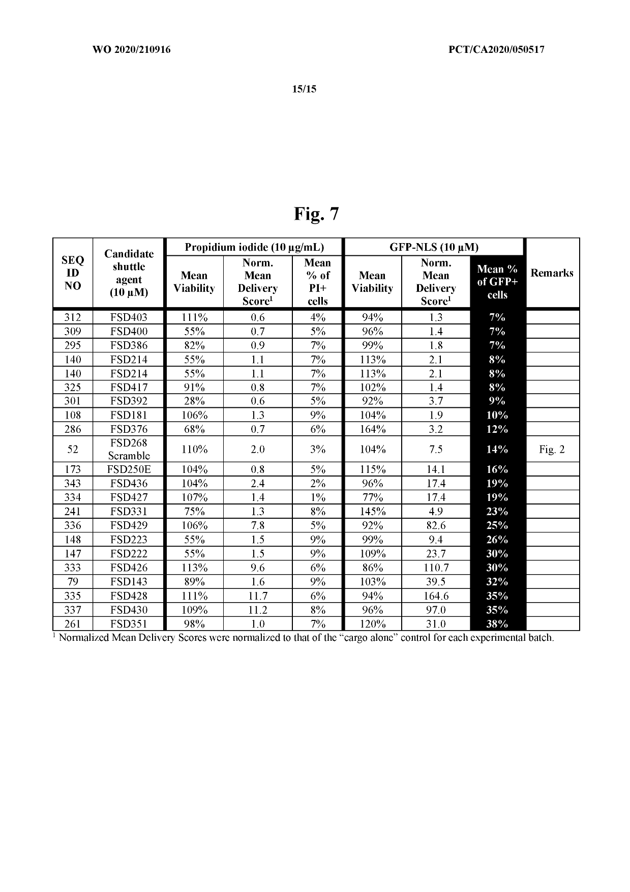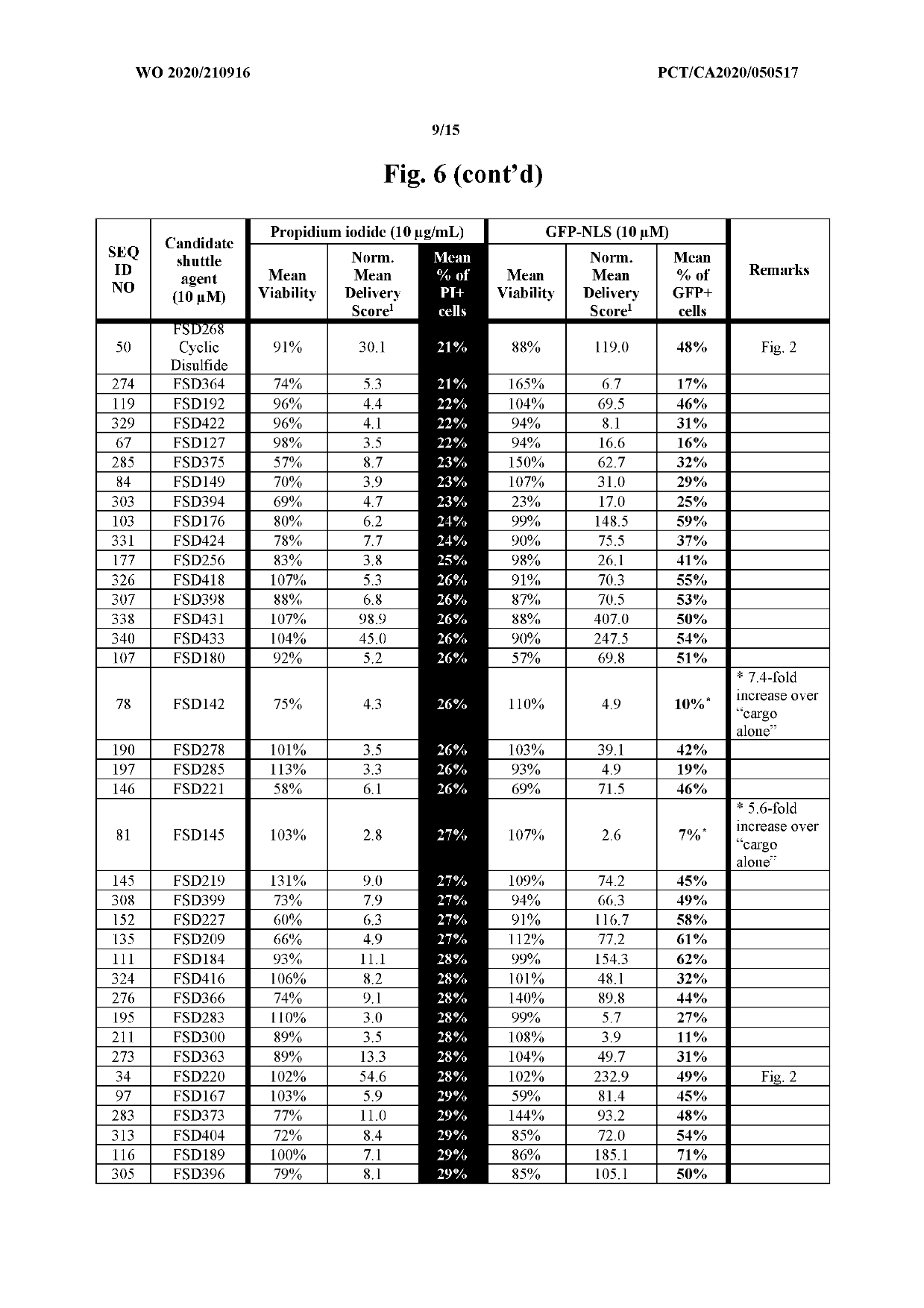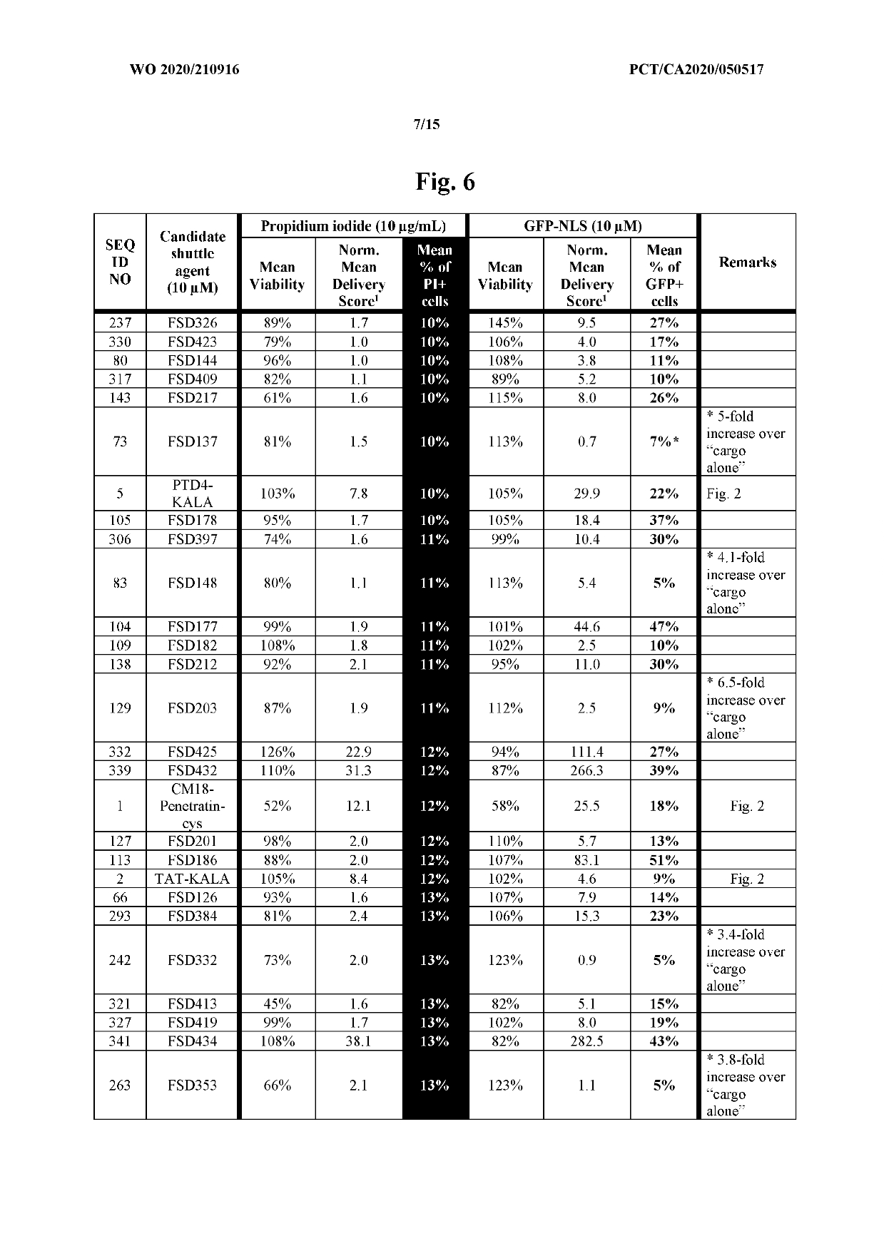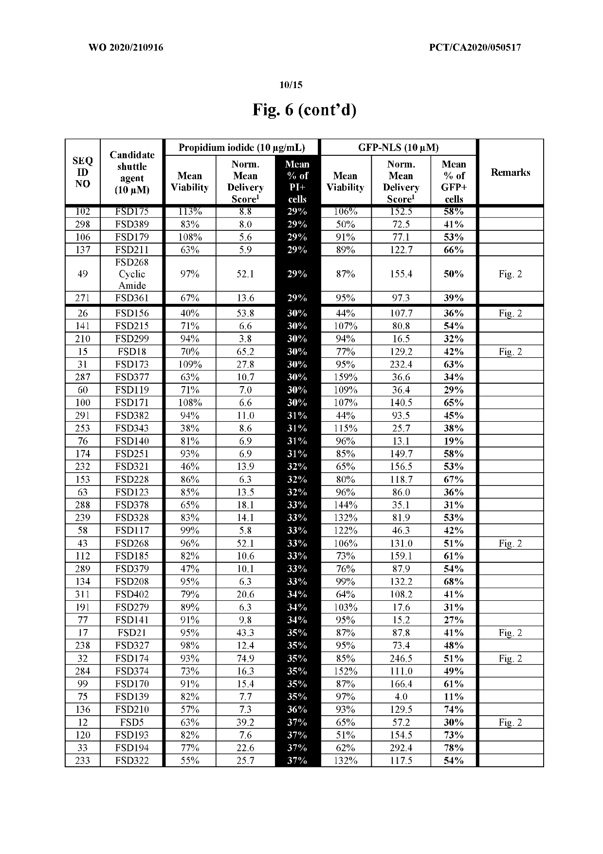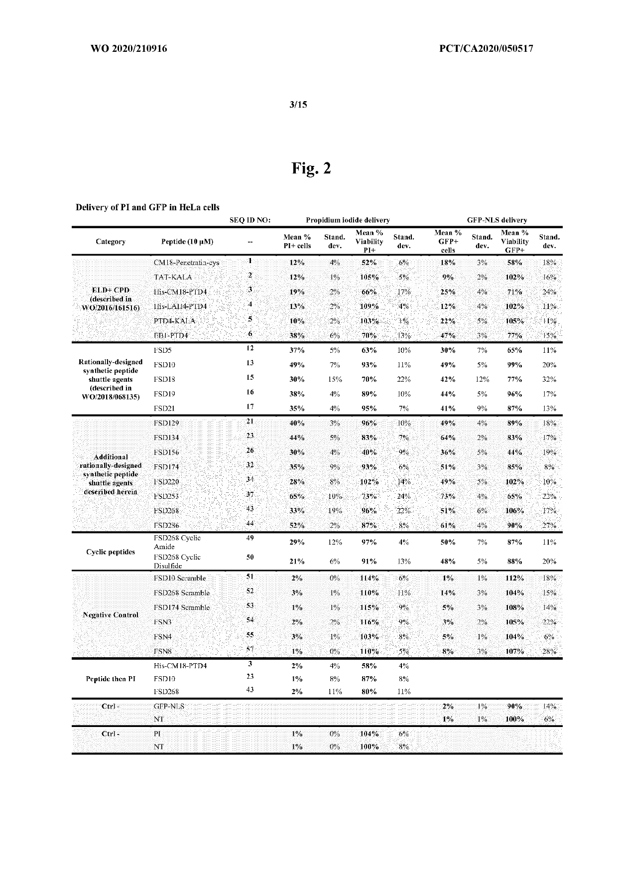 (EN) Abstract Described herein are methods, compositions, kits and synthetic peptide shuttle agents relating to the transduction of proteinaceous and/or non-proteinaceous cargoes. The method generally comprises contacting target eukaryotic cells with a non-proteinaceous cargo and a concentration of a synthetic peptide shuttle agent sufficient to increase the transduction efficiency of the non-proteinaceous cargo, as compared to in the absence 5 of said synthetic peptide shuttle agent. In embodiments, the non-proteinaceous cargo may be a drug, such as a small molecule drug, for treating a disease. In other embodiments, novel synthetic peptide shuttle agents having transduction activity for proteinaceous and/or non-proteinaceous cargoes are described, as well as the use of propidium iodide or other membrane-impermeable fluorescent DNA intercalating agent as a surrogate cargo for selecting versatile synthetic peptide shuttle agents having transduction activity for both proteinaceous and non-10 proteinaceous cargoes. Fig. 3 78