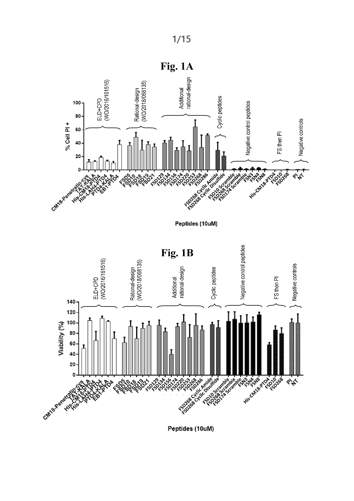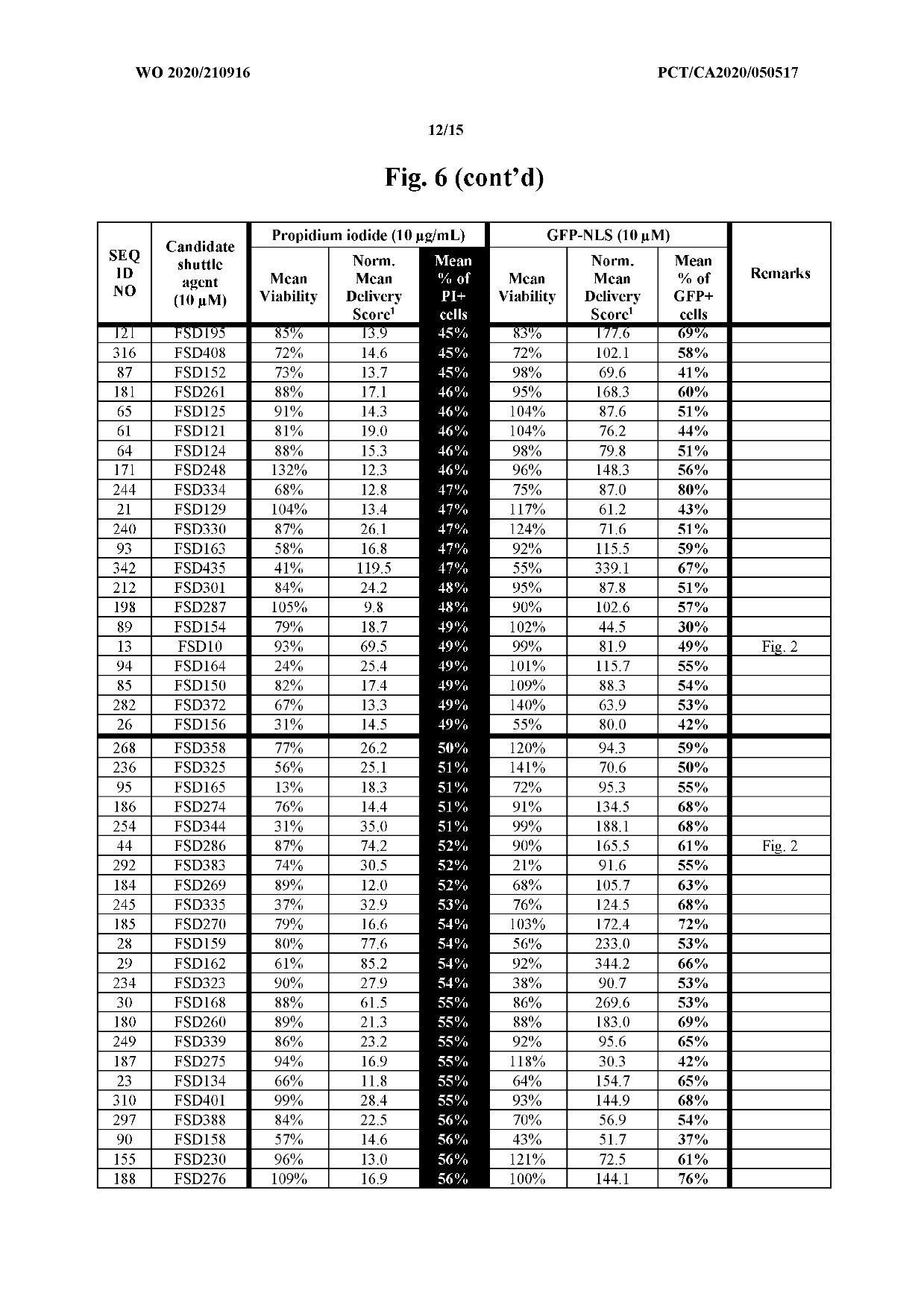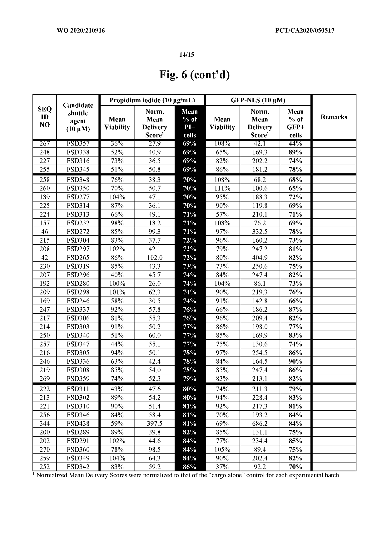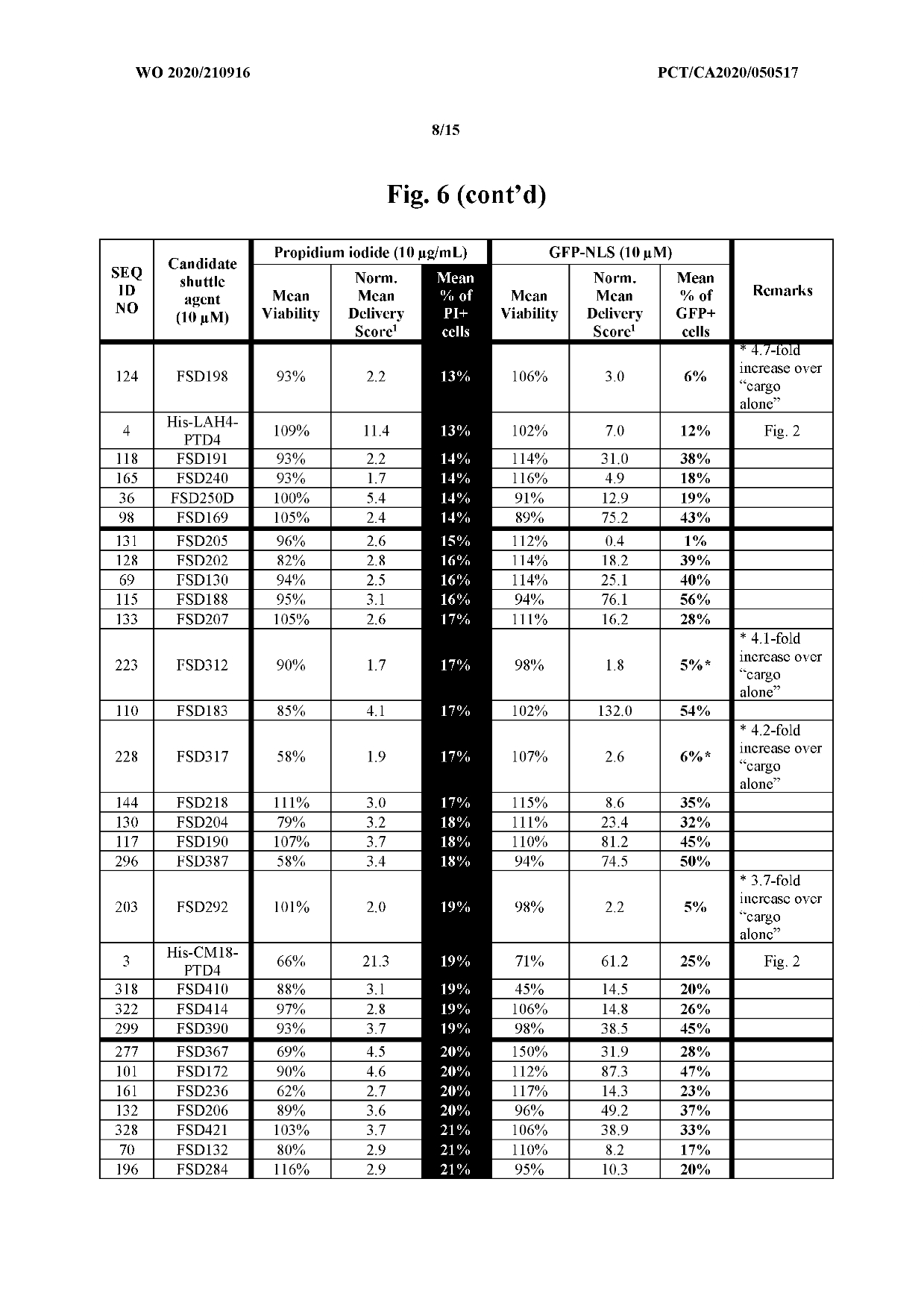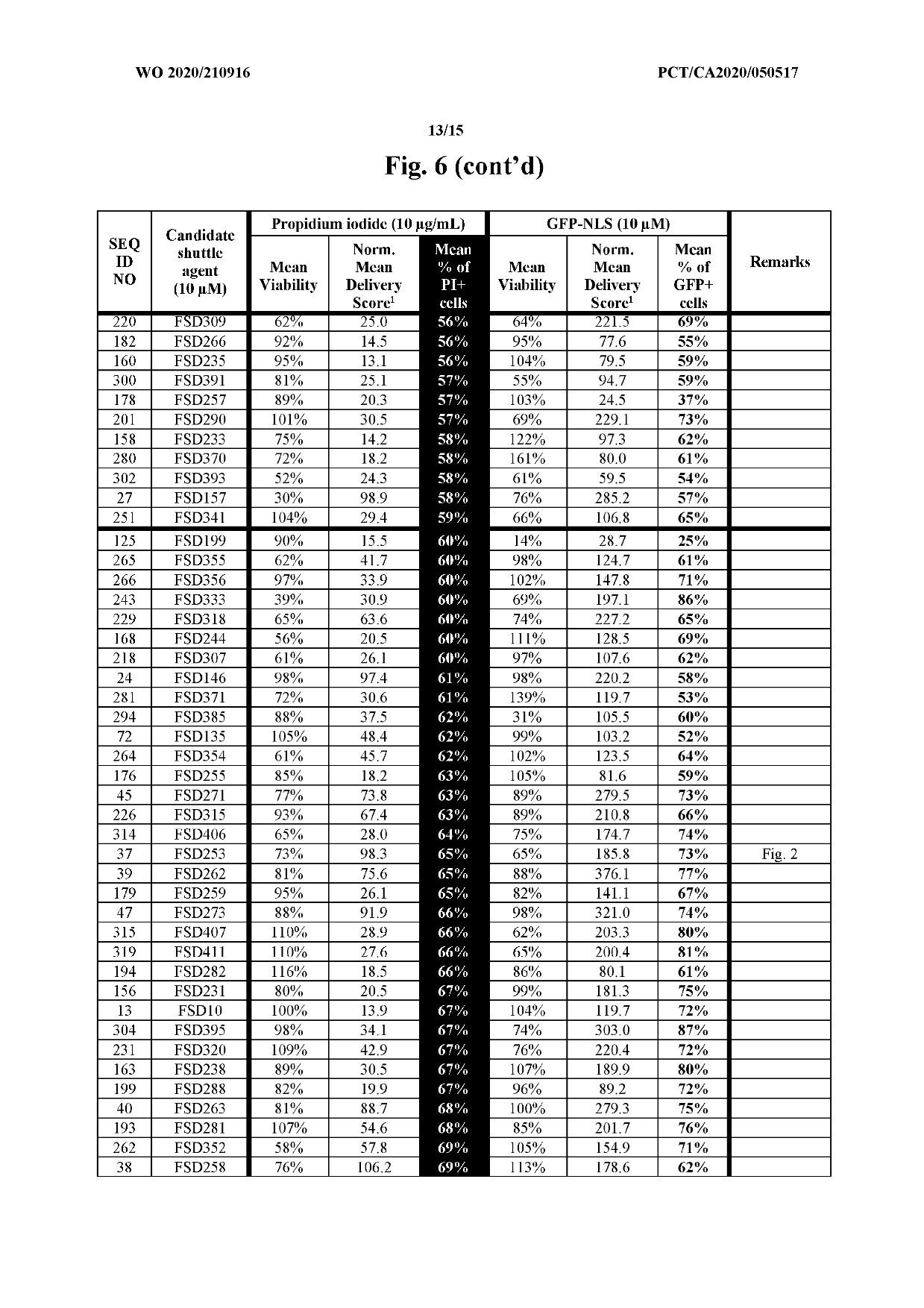 (EN) Abstract Described herein are methods, compositions, kits and synthetic peptide shuttle agents relating to the transduction of proteinaceous and/or non-proteinaceous cargoes. The method generally comprises contacting target eukaryotic cells with a non-proteinaceous cargo and a concentration of a synthetic peptide shuttle agent sufficient to increase the transduction efficiency of the non-proteinaceous cargo, as compared to in the absence 5 of said synthetic peptide shuttle agent. In embodiments, the non-proteinaceous cargo may be a drug, such as a small molecule drug, for treating a disease. In other embodiments, novel synthetic peptide shuttle agents having transduction activity for proteinaceous and/or non-proteinaceous cargoes are described, as well as the use of propidium iodide or other membrane-impermeable fluorescent DNA intercalating agent as a surrogate cargo for selecting versatile synthetic peptide shuttle agents having transduction activity for both proteinaceous and non-10 proteinaceous cargoes. Fig. 3 78