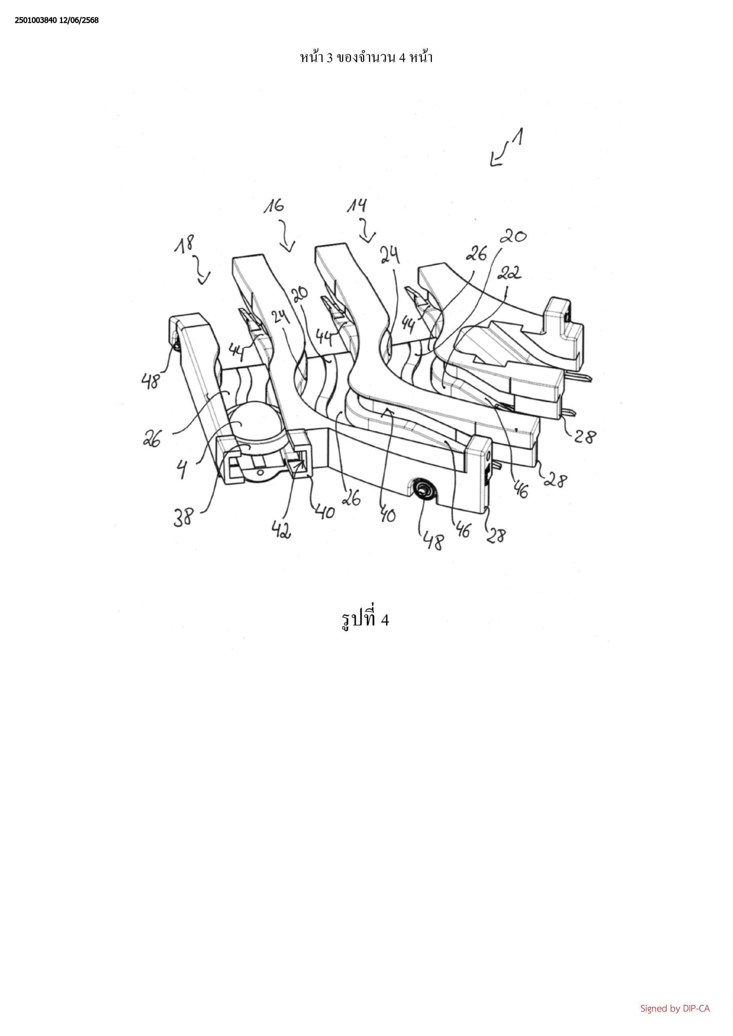 ด้านล่าง และอย่างน้อยหนึ่งผนังด้านข้าง (28) เพิ่มเติมมีทางลาด (44), ซึ่งถูกออกแบบเพื่อนำทางตัว