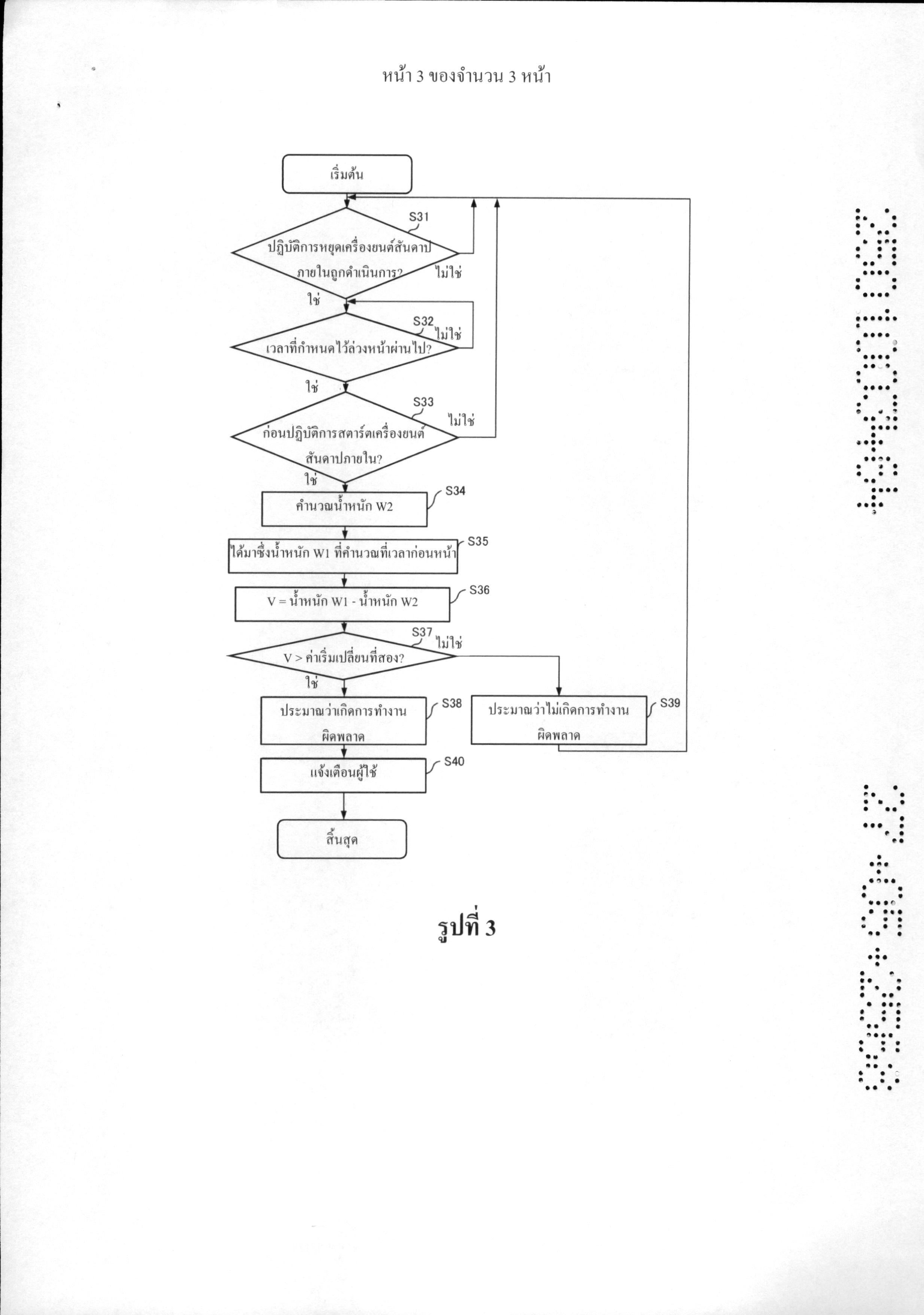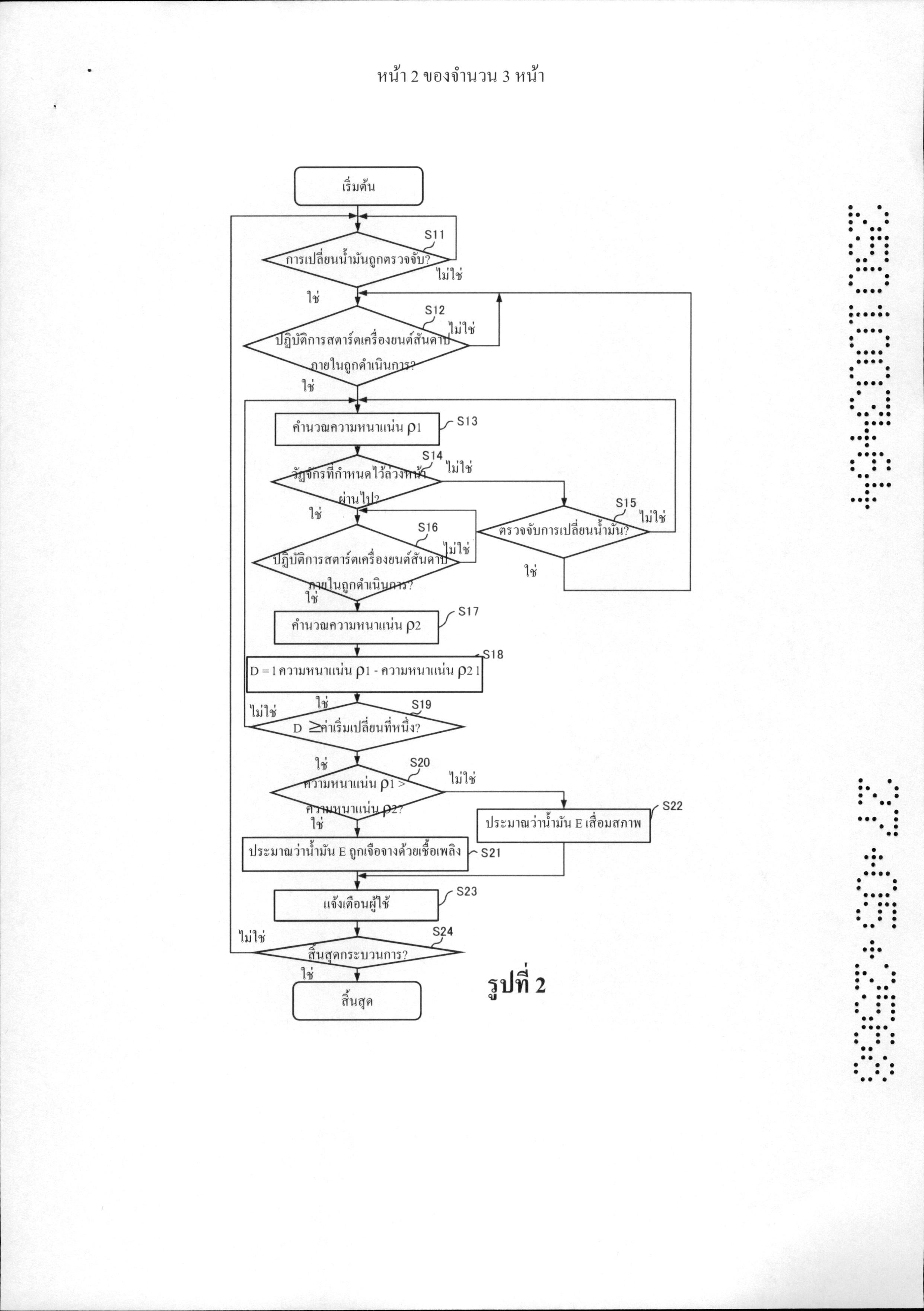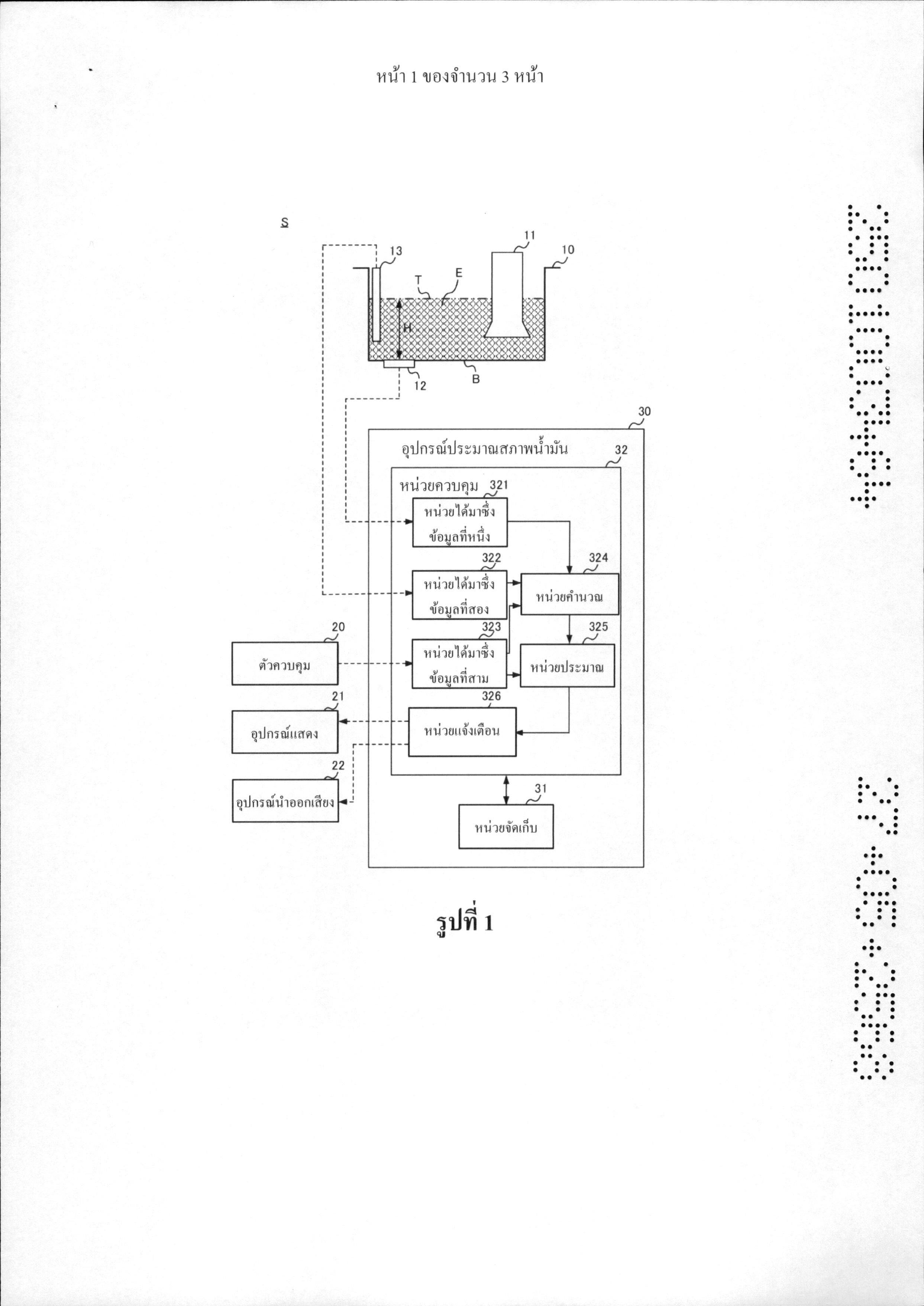 1. อุปกรณ์ประมาณสภาพน้ำมันที่ประกอบรวมด้วย หน่วยได้มาซึ่งข้อมูลที่หนึ่งที่ได้มาซึ่งความดันของน้ำมันที่ถูกจัดเก็บไว้ในอ่างน้ำมันจากตัว รับรู้ความดันที่ถูกจัดไว้บนพื้นผิวด้านล่างของอ่างน้ำมันของเครื่องยนต์สันดาปภายใน, หน่วยได้มาซึ่งข้อมูลที่สองที่ได้มาซึ่งระยะห่างระหว่างพื้นผิวด้านล่างกับระดับของเหลวของ น้ำมันจากตัวรับรู้ระดับที่ถูกจัดไว้ในอ่างน้ำมัน และ หน่วยคำนวณที่คำนวณความหนาแน่นของน้ำมันบนพื้นฐานของความดันและระยะห่าง 2. อุปกรณ์ประมาณสภาพน้ำมันตามข้อถือสิทธิที่ 1 ที่ประกอบรวมเพิ่มเติมด้วย หน่วยประมาณที่ประมาณว่าสภาพของน้ำมันผิดปกติเมื่อความต่างความหนาแน่นซึ่งแสดง แทนความต่างระหว่างความหนาแน่นที่หนึ่งที่คำนวณด้วยหน่วยคำนวณที่เวลาที่หนึ่งกับความ หนาแน่นที่สองที่คำนวณด้วยหน่วยคำนวณที่เวลาที่สองหลังจากเวลาที่หนึ่งเท่ากับหรือมากกว่าค่าเริ่ม เปลี่ยน 3. อุปกรณ์ประมาณสภาพน้ำมันตามข้อถือสิทธิที่ 2, ที่ซึ่งหน่วยประมาณประมาณว่า น้ำมันเสื่อมสภาพในกรณีที่ความต่างความหนาแน่นเท่ากับหรือมากกว่าค่าเริ่มเปลี่ยนและความ หนาแน่นที่หนึ่งน้อยกว่าความหนาแน่นที่สอง 4. อุปกรณ์ประมาณสภาพน้ำมันตามข้อถือสิทธิที่ 2 หรือ 3, ที่ซึ่งหน่วยประมาณ ประมาณน้ำมันถูกเจือจางด้วยเชื้อเพลิงที่ถูกฉีดเข้าไปในเครื่องยนต์สันดาปภายในในกรณีที่ความต่าง ความหนาแน่นเท่ากับหรือมากกว่าค่าเริ่มเปลี่ยนและความหนาแน่นที่หนึ่งมากกว่าความหนาแน่นที่ สอง 5. อุปกรณ์ประมาณสภาพน้ำมันตามข้อใดข้อหนึ่งในข้อถือสิทธิที่ 2 ถึง 4, ที่ซึ่ง ระยะห่างที่ตัวเคลื่อนที่ที่ถูกติดตั้งด้วยเครื่องยนต์สันดาปภายในเดินทางหลังจากน้ำมันที่ถูกจัดเก็บไว้ ในอ่างน้ำมันถูกเปลี่ยนยิ่งมาก หน่วยประมาณจะยิ่งลดค่าเริ่มเปลี่ยน 6. อุปกรณ์ประมาณสภาพน้ำมันตามข้อใดข้อหนึ่งในข้อถือสิทธิที่ 2 ถึง 5, ที่ซึ่งหน่วย คำนวณคำนวณความหนาแน่นที่หนึ่งด้วยการตรวจจับการเปลี่ยนของน้ำมันที่ถูกจัดเก็บไว้ในอ่าง น้ำมัน 7. อุปกรณ์ประมาณสภาพน้ำมันตามข้อใดข้อหนึ่งในข้อถือสิทธิที่ 2 ถึง 6, ที่ซึ่งหน่วย คำนวณคำนวณปริมาณเชิงสถิติของความหนาแน่นที่สองจำนวนหนึ่งสำหรับวัฏจักรที่หนึ่งที่กำหนด ไว้ล่วงหน้าแต่ละวัฏจักรในวัฏจักรที่สองซึ่งยาวนานกว่าวัฏจักรที่หนึ่งเป็นความหนาแน่นที่สอง 8. อุปกรณ์ประมาณสภาพน้ำมันตามข้อใดข้อหนึ่งในข้อถือสิทธิที่ 2 ถึง 7, ที่ซึ่งหน่วย คำนวณคำนวณอย่างน้อยหนึ่งในความหนาแน่นที่หนึ่งหรือความหนาแน่นที่สองภายในระยะเวลา ตั้งแต่ช่วงเวลาที่ได