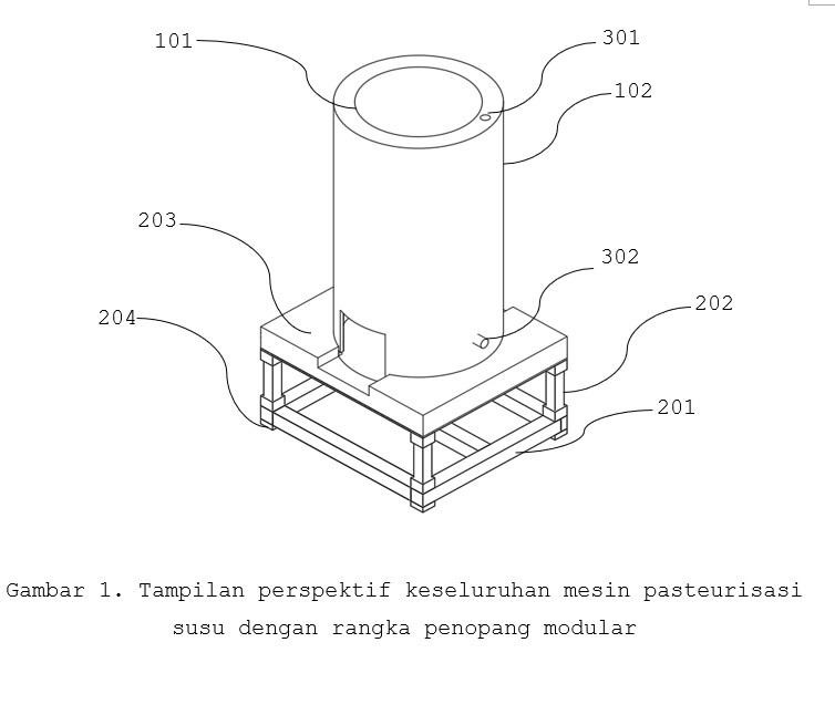 Invensi ini berkaitan dengan mesin pasteurisasi susu yang menggunakan struktur water jacket dengan jarak annular seragam untuk menghasilkan distribusi panas yang lebih stabil selama proses pemanasan. Mesin terdiri dari tabung dalam sebagai wadah susu dan tabung luar sebagai jaket air, di mana jarak annular antara keduanya dipertahankan melalui elemen penahan jarak yang dipasang pada tabung dalam. Invensi ini juga mencakup rangka penopang modular yang menopang tabung water jacket dan dapat dibongkar pasang melalui sambungan mekanis tanpa pengelasan permanen. Struktur tersebut meningkatkan efisiensi pemanasan, mengurangi risiko deformasi akibat pemuaian termal, serta mempermudah perawatan dan penggantian komponen. Invensi ini memberikan penyempurnaan mekanis yang praktis untuk mesin pasteurisasi susu skala kecil hingga menengah.