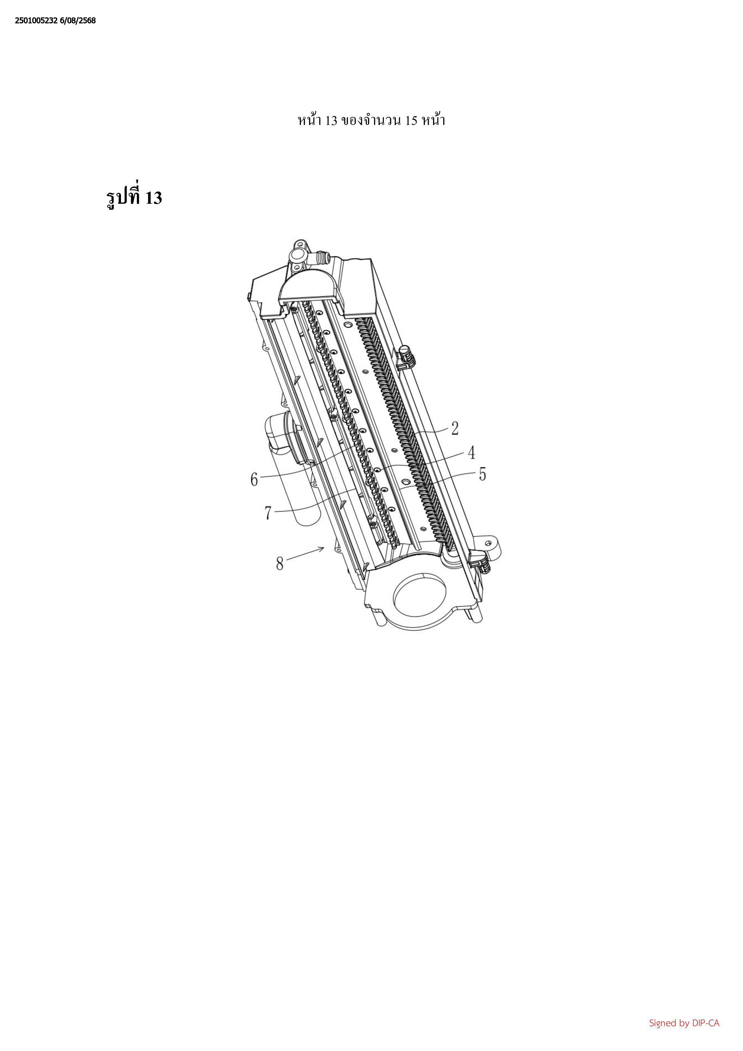 หัวพ่นน้ำ (4), ใบรีดน้ำ (5), และแท่งทำให้ฟู (2) ถูกจัดเตรียมอย่างเป็นลำดับในทิศทางการ