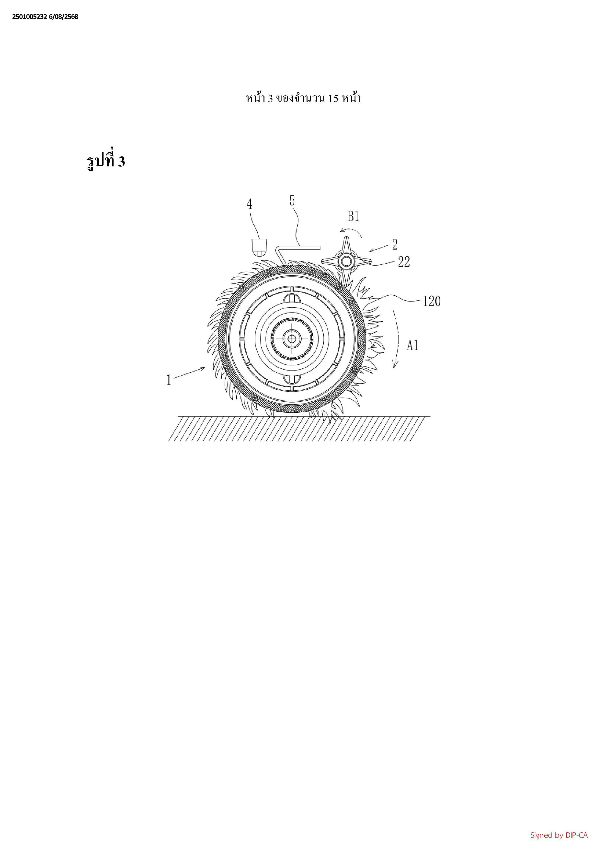 ทางการหมุนของหัวถูพื้นแบบลูกกลิ้ง (1), และอัตราเร็วตามเส้นรอบวงของฟันที่ยื่นออก (22) ของ