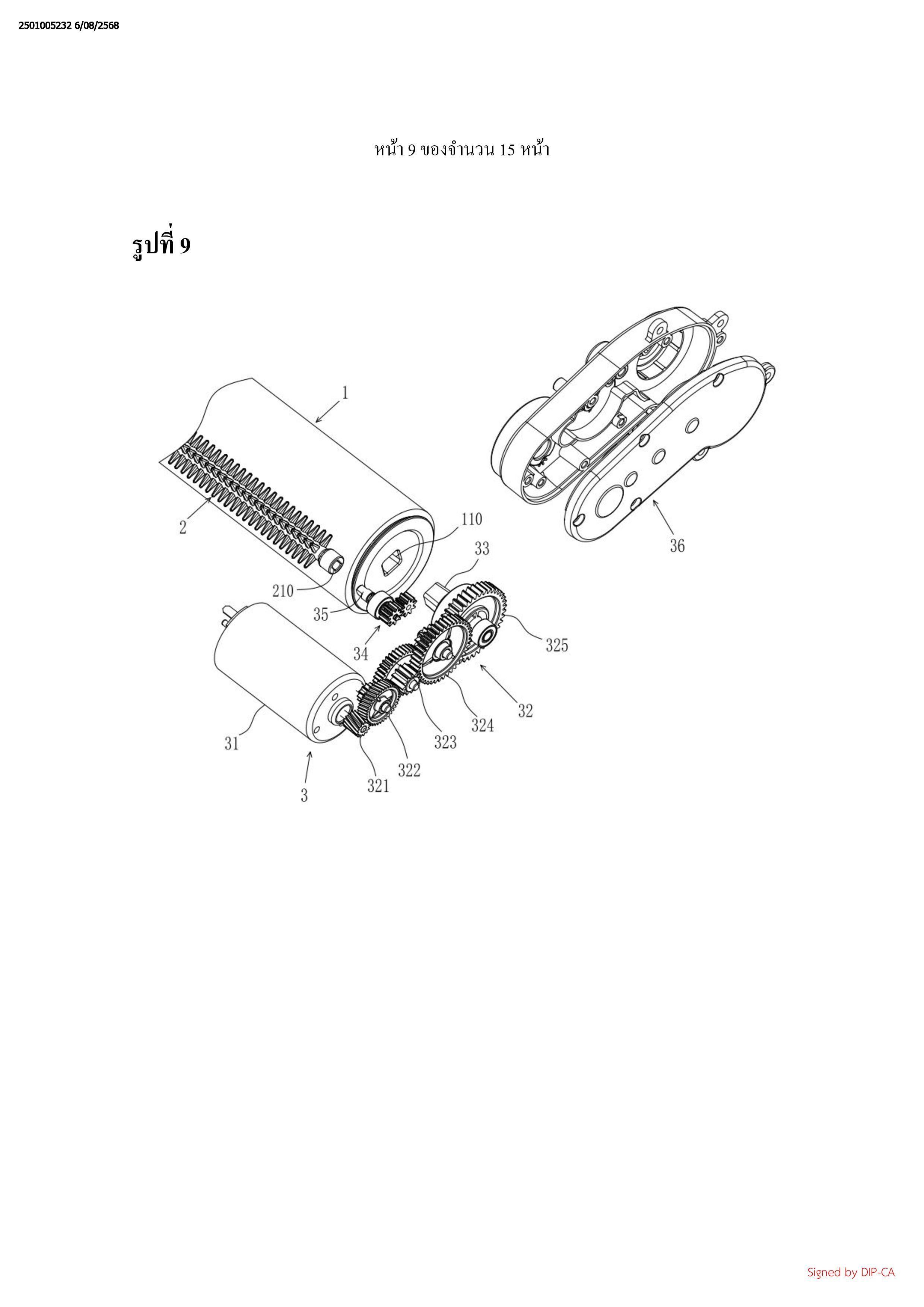 รวมด้วยมอเตอร์ (31), ชุดเฟืองที่หนึ่ง (32), และชุดเฟืองที่สอง (34);