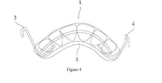 ເຄື່ອງມີດັດແຂ້ວເພື່ອດຶງແຂ້ວດ້ານໜ້າເບື້ອງເທິງໃຫ້ສວດອອກມາ ເພື່ອສ້າງຄວາມສົມດູນໃຫ້ກັບໃບໜ້າປະກອບດ້ວຍອຸປະກອນສ່ວນທີ 1 ເຂິ່ງປະກອບດ້ວຍແຜ່ນເທິງ (5) ທີ່ຢູ່ດ້ານຫຼັງຂອງແຂ້ວທາງໜ້າເບື້ອງເທິງ 6 ເຫຼັ້ມ ແລະ ຍຶດຕິດຢ່າງໜາແໜ້ນດ້ວຍກາວຕິດແຂ້ວ ໂດຍມີຂໍເກາະສ່ວນທີ 2 (4) ຕິດຢູ່ກັບແຜ່ນເທິງ (5) ຂອງອຸປະກອນສ່ວນທີ 1 ແລະ ອຸປະກອນສ່ວນທີ 2 (2) ເຊິ່ງປະກອບດ້ວຍແຜ່ນຂວາ (6) ແລະ ແຜ່ນຊ້າຍ (7) ປົກຫຸ້ມແຂ້ວຫຼັງເບື້ອງເທິງທັງໝົດ ໂດຍລວມເສັ້ນທີ 1(8) ຕິດຢູ່ກັບແຜ່ນຂວາ (6) ແລະ ແຜ່ນຊ້າຍ (7) ແລະ ລວດເສັ້ນທີ 2 (9) ເຊິ່ງເປັນເສັ້ນລວດສະແຕນເລດແບບສະປີງແຂງ ທີ່ແຂ້ວກົດເຫຼັ້ມນ້ອຍເຮັດເປັນຮູບ U-Loop ຊ້າຍ (12) ແລະ U-Loop (13) ໃນຂະນະທີປາຍທັງສອງຂ້າງຂອງລວດຕິດກັບແຜ່ນຂວາ (6) ແລະ ແຜ່ນຊ້າຍ (7)