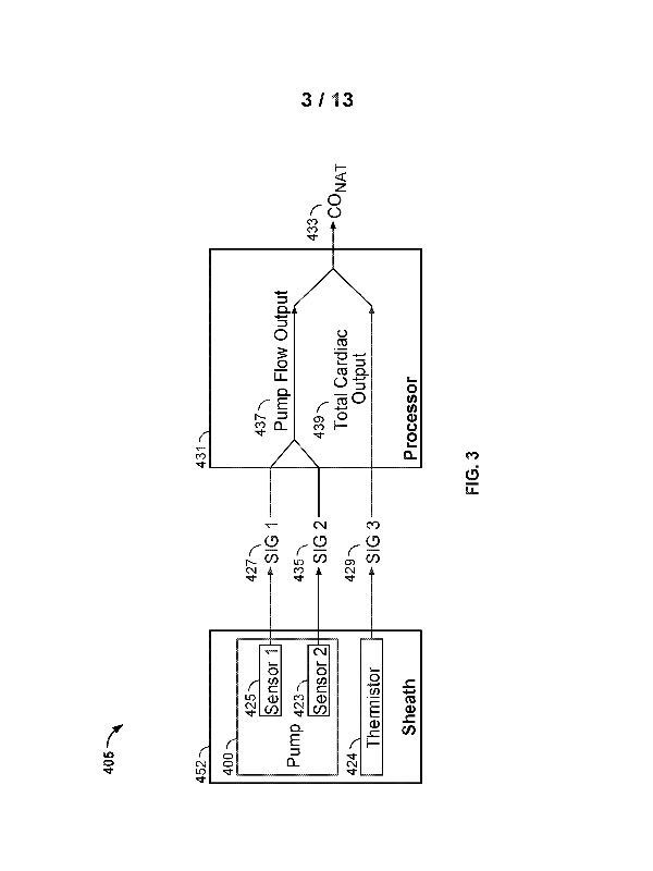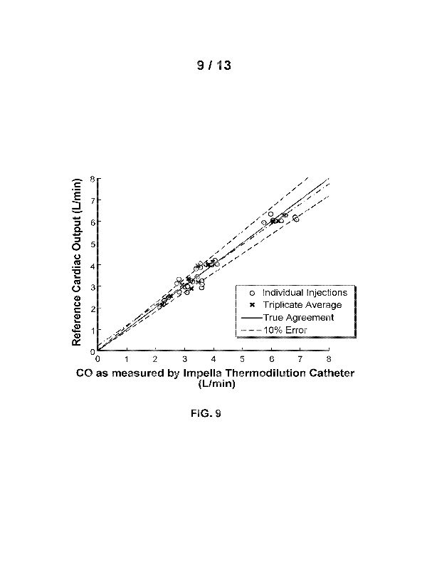 (EN) SYSTEM AND METHOD FOR DETERMINING NATIVE CARDIAC OUTPUT WHILE CONTINUING SUPPORT TO THE HEART WITH A CATHETER- MOUNTED INTRACARDIAC BLOOD PUMP HAVING AN IMBEDDED THERMISTOR Abstract [74] A system and method for determining native cardiac output of a heart while maintaining operation of an intracardiac blood pump includes determining a current drawn by the pump motor, a blood pressure within the ascending aorta, and a change in the blood temperature based on a thermodilution technique. An intracardiac blood pump positioned in the aorta includes at least one sensor for determining a motor current and blood pressure and a thermistor for determining the change in blood temperature after a precise fluid bolus has been introduced into the vasculature. A processor receives current, pressure, and temperature measurements, and calculates a pump flow output and a total cardiac output from which the native cardiac output is calculated. The native cardiac output and other clinically relevant variables derived from the measurements inform decisions related to continued therapeutic care, including increasing or decreasing cardiac assistance provided by the intracardiac pump. [Fig. 3] - 33 -