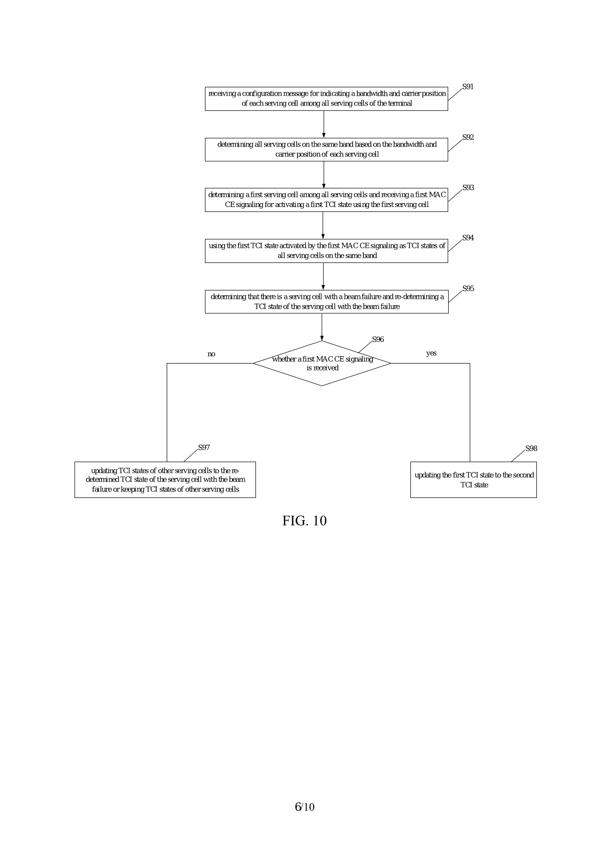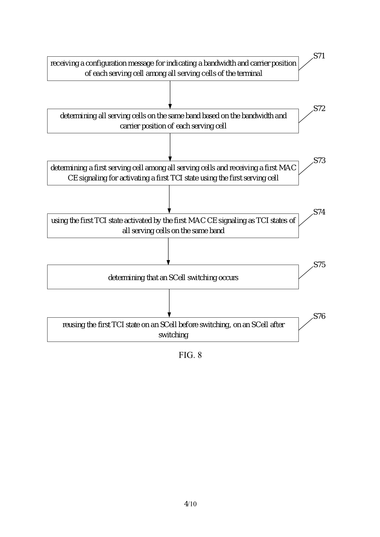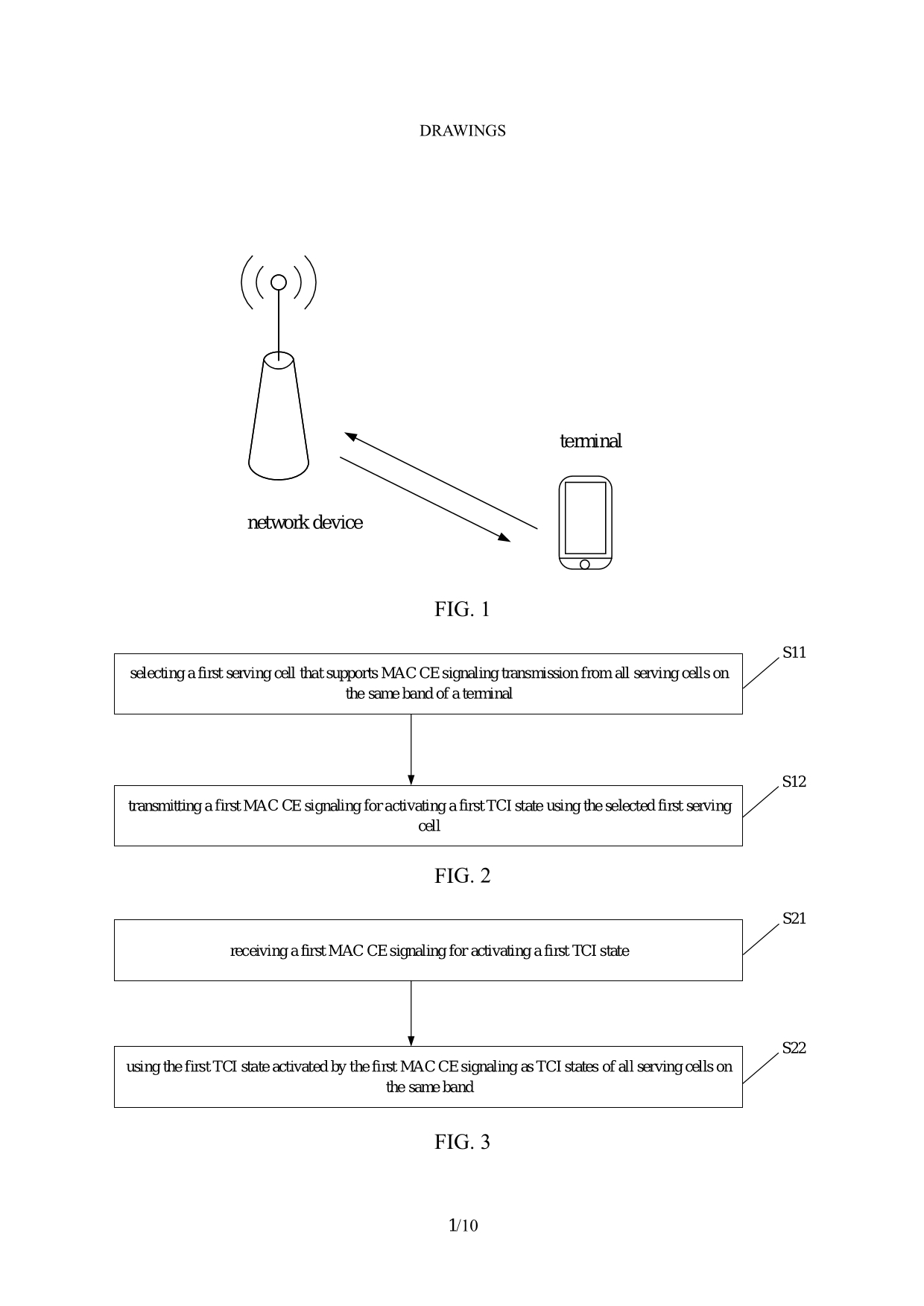 (EN) ABSTRACT A method for activating a TCI state includes: receiving a first MAC CE signaling, the first MAC CE signaling for activating a first TCI state; and using the first TCI state as TCI states of all serving cells on the same frequency band. Fig. 3 39