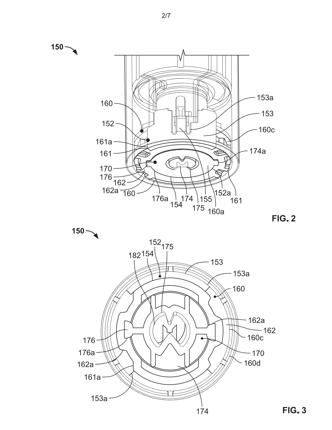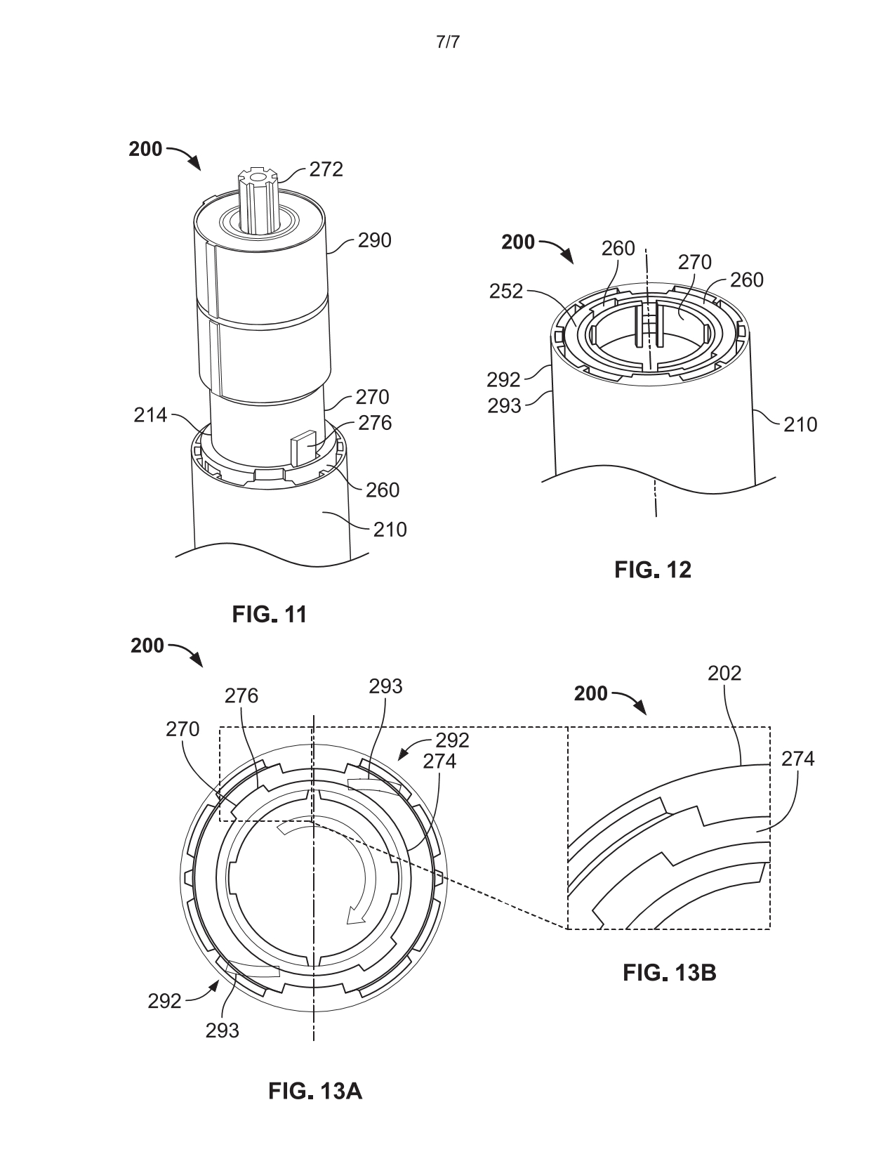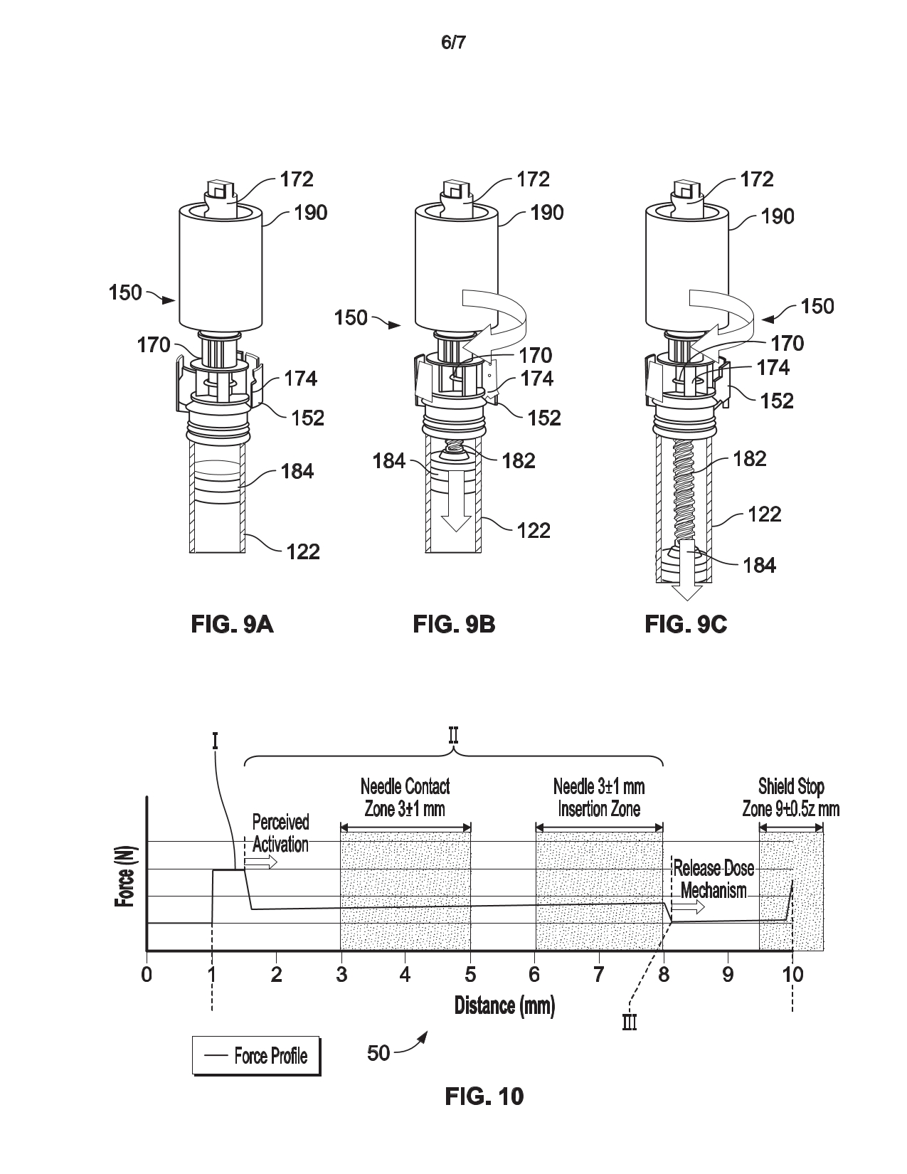 (EN) 21 ACTIVATION MECHANISM FOR DRUG DELIVERY DEVICE ABSTRACT A drug delivery device includes a housing, an injection assembly at least partially disposed in the housing, a shield, and a drive assembly at least partially disposed in the housing and coupled with the injection assembly and the shield. The shield has an extended position where at least a proximal end thereof extends a distance beyond a proximal end of the housing. The injection assembly includes a needle or cannula having an endpoint. Upon moving the shield axially towards the distal end of the housing a predetermined distance, a retraction profile commences whereby the drive assembly administers a medicament via the injection assembly. A peak resistance force is exerted within approximately the first 12mm of axial movement of the shield. Fig. 1