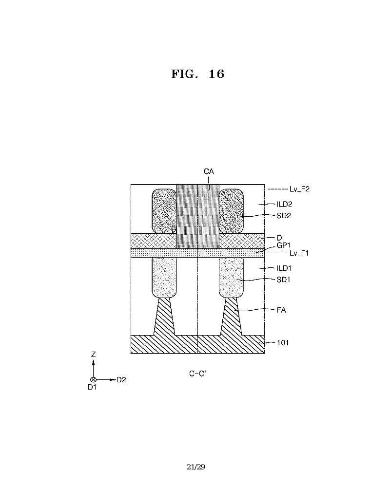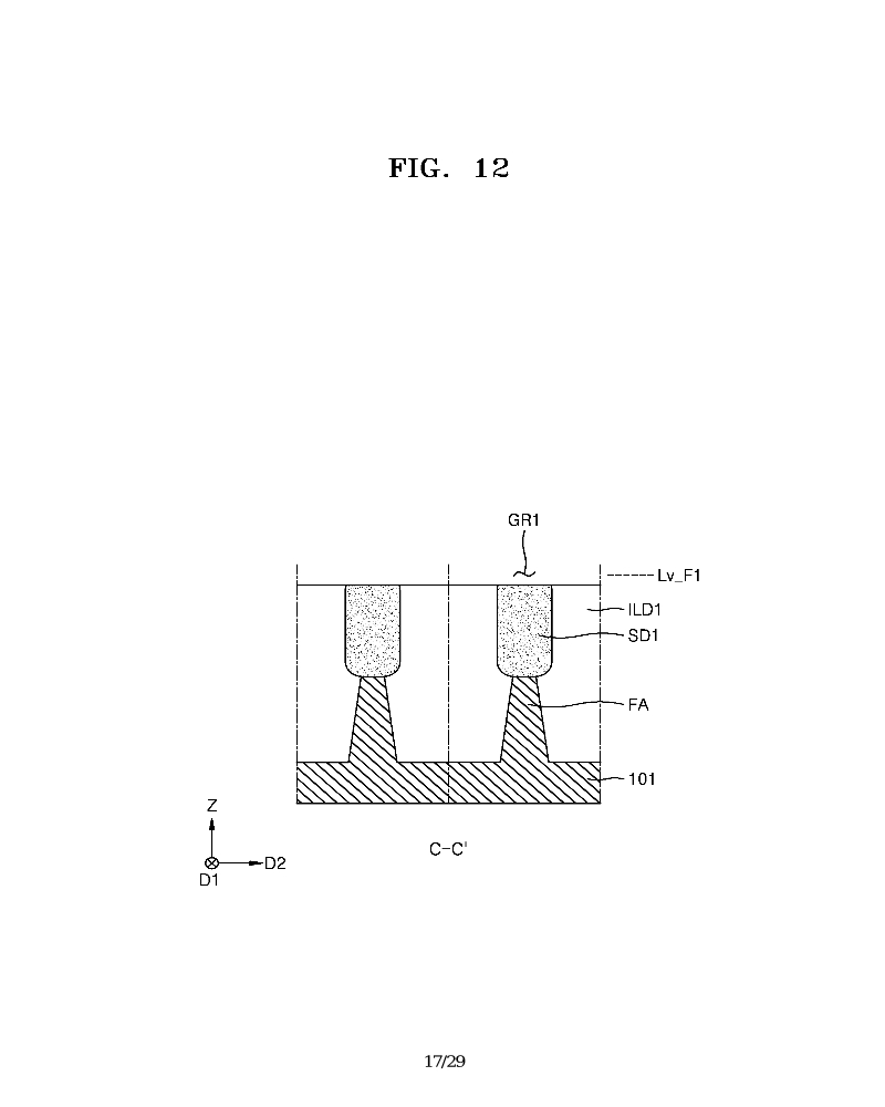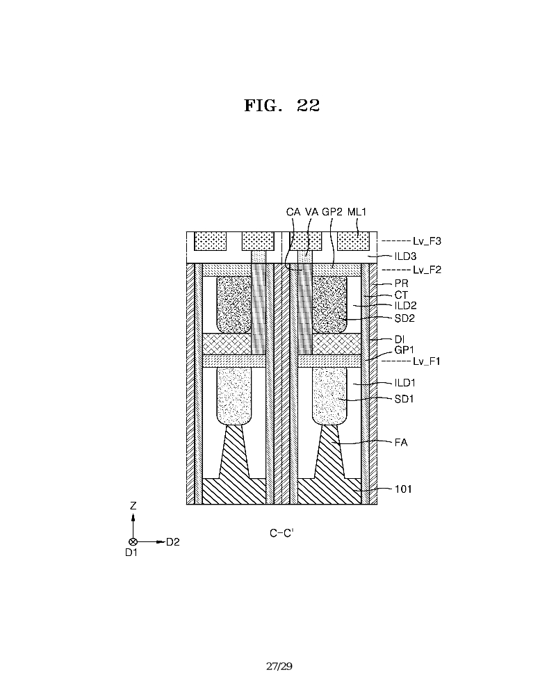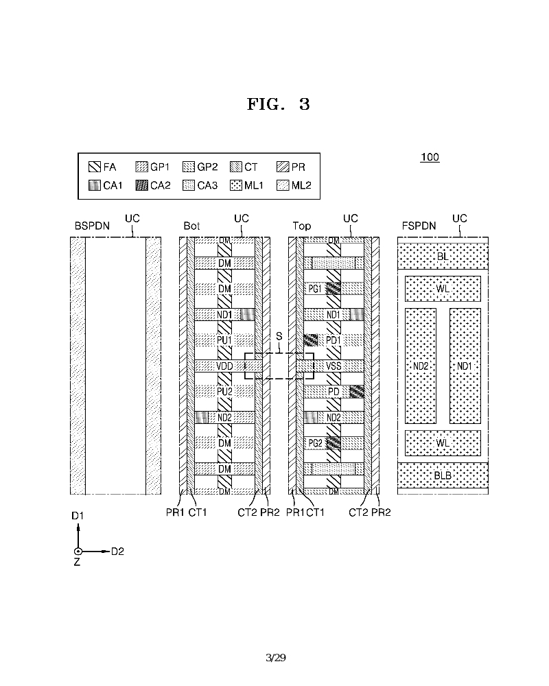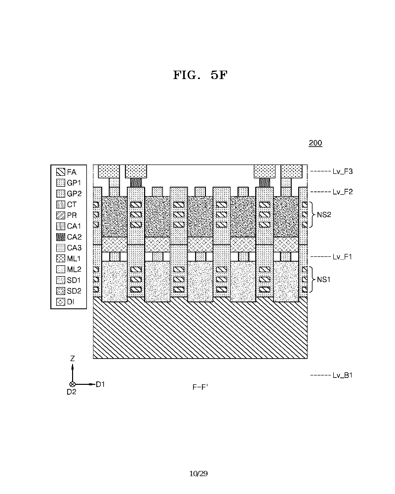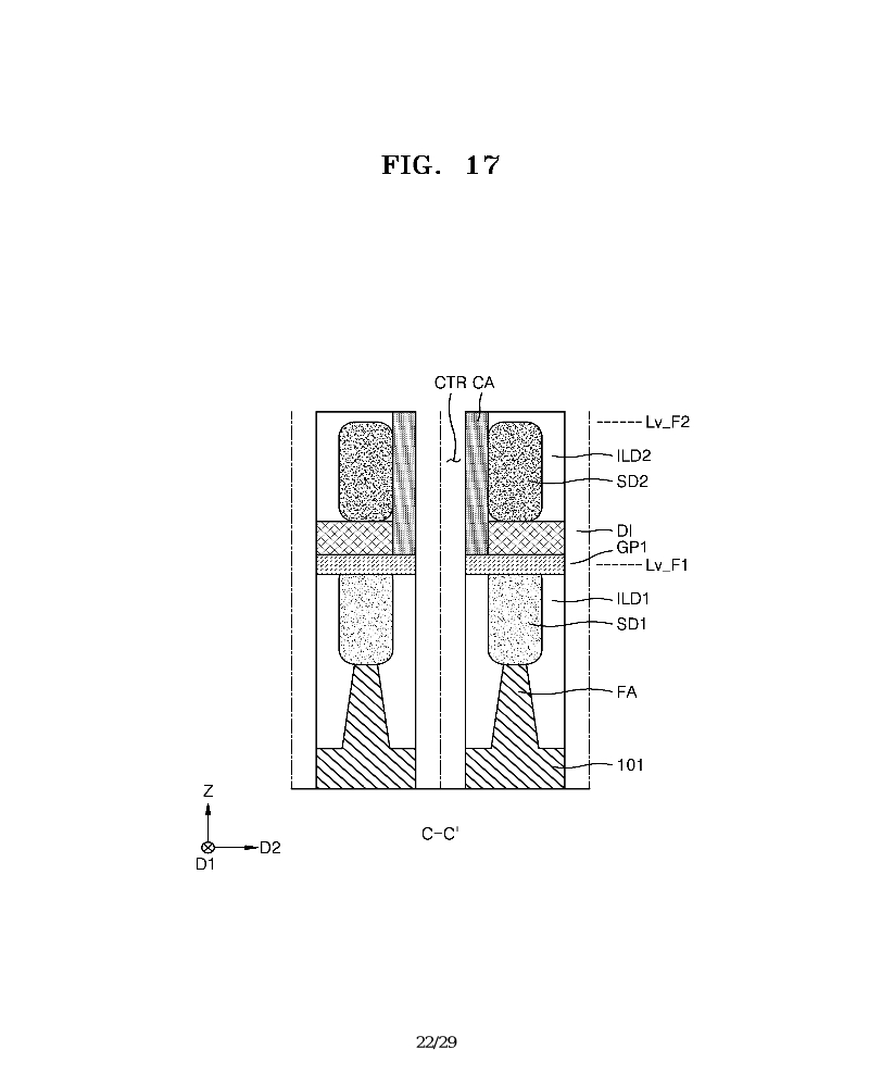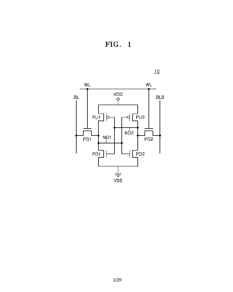 (EN) ABSTRACT According to the inventive concept, based on the layout of a 3-dimensional stack structure enabling minimization of the planar area occupied by unit cells and simplification of the configuration of a wiring connection structure between transistors defining at least a portion of an SRAM device, an integrated circuit with a reduced size and improved reliability may be implemented. FIG. 3 28