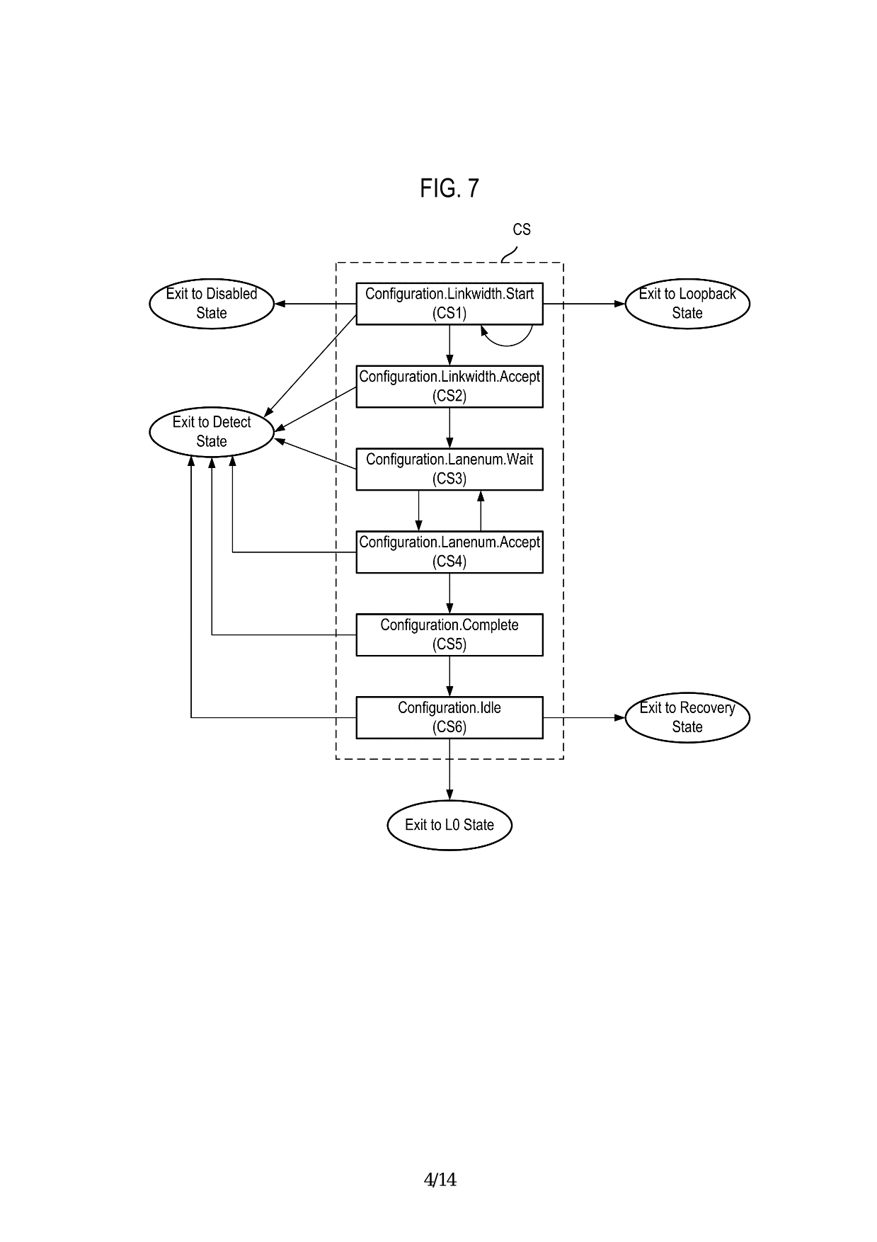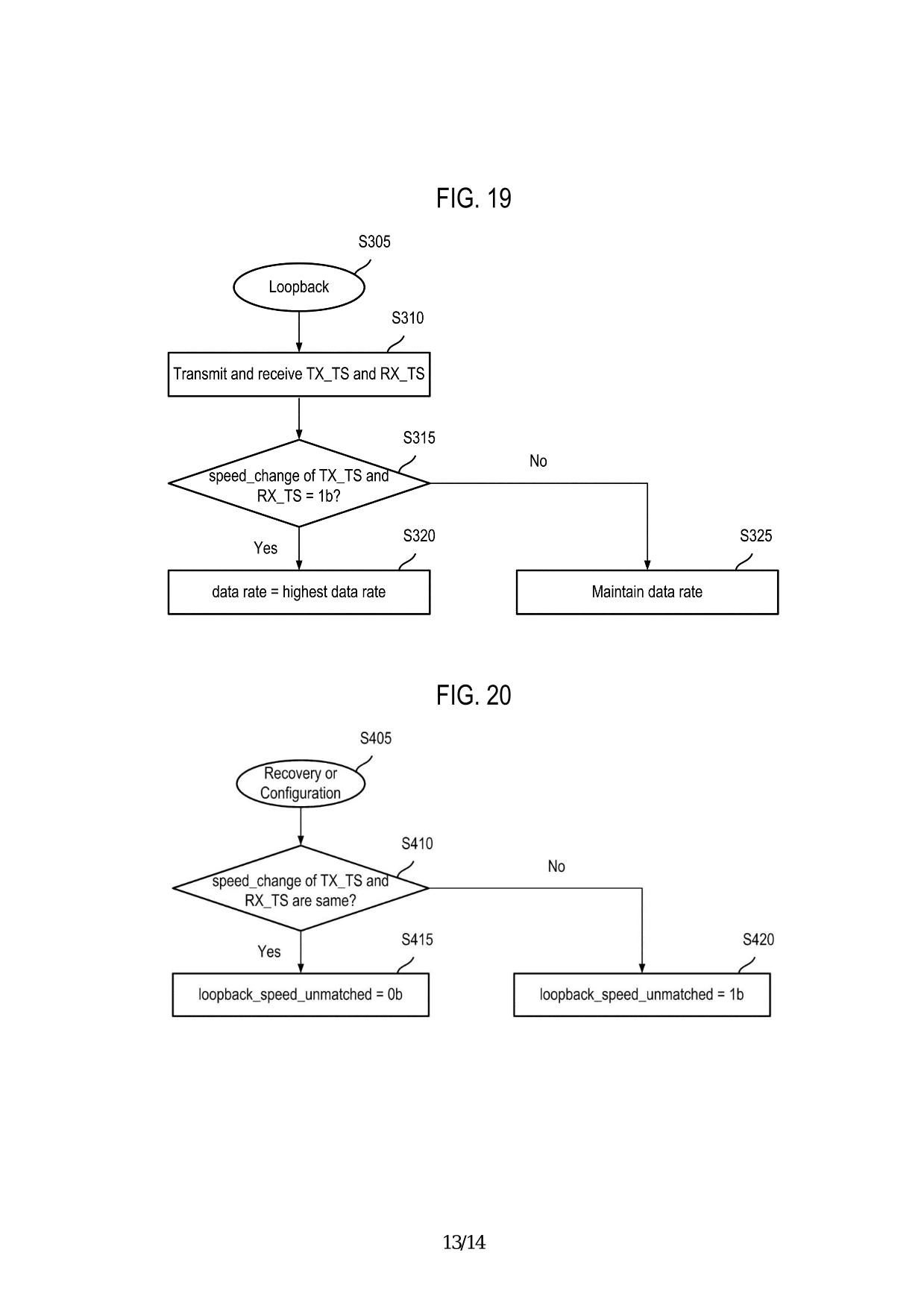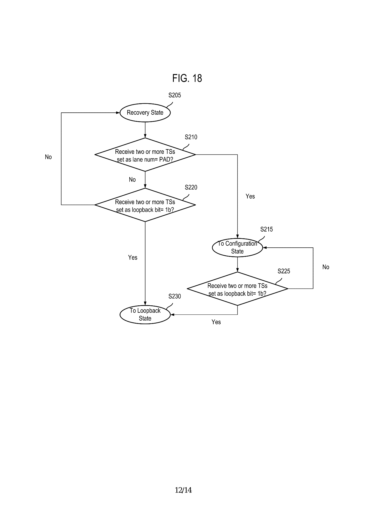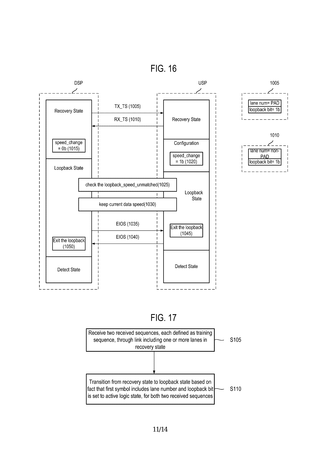 (EN) ABSTRACT A device includes a port connected to a link including one or more lanes to support communication between the device and another device; and a controller that controls the link based on a link training and status state machine (LTSSM). The port may receive two received sequences, each defined as a training sequence, through the link in a recovery state included in the LTSSM. The training sequence may include a first symbol, including a lane number or a special symbol, and a second symbol including a loopback bit. The controller may transition from the recovery state to a loopback state included in the LTSSM, based on the first symbol including the lane number and the loopback bit being set to an active logic state, for both of the two received sequences. FIG. 10 42