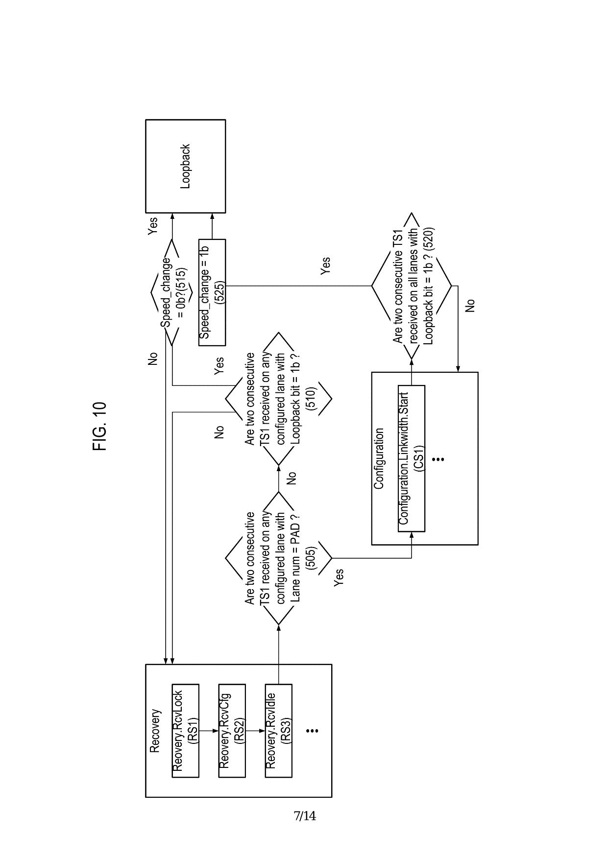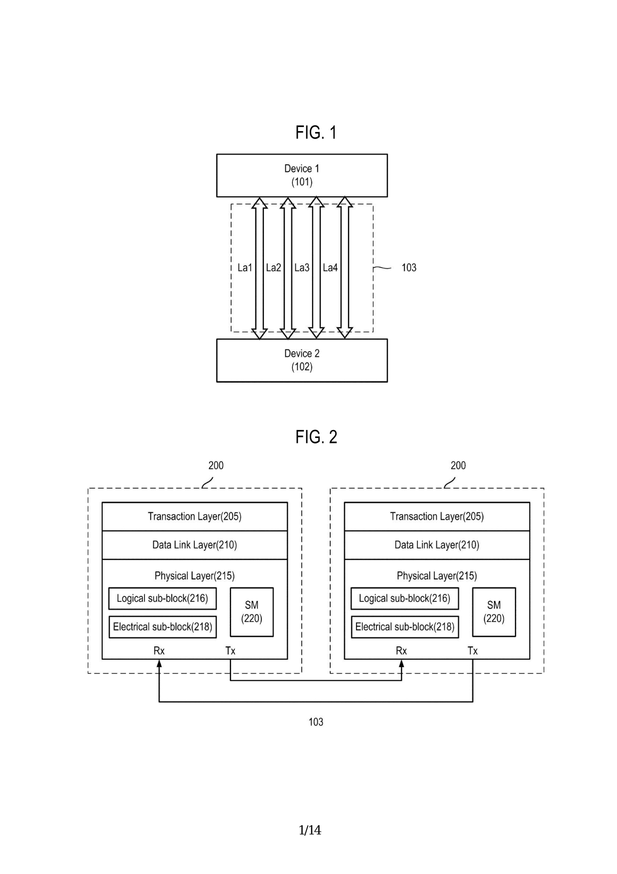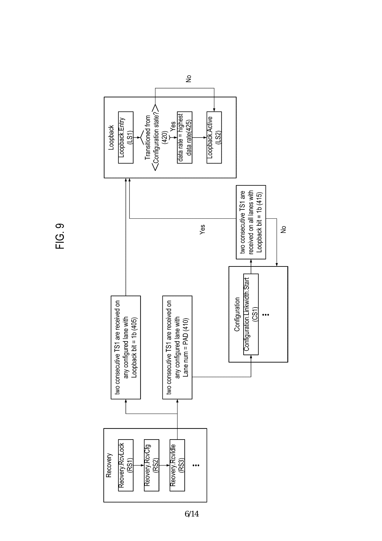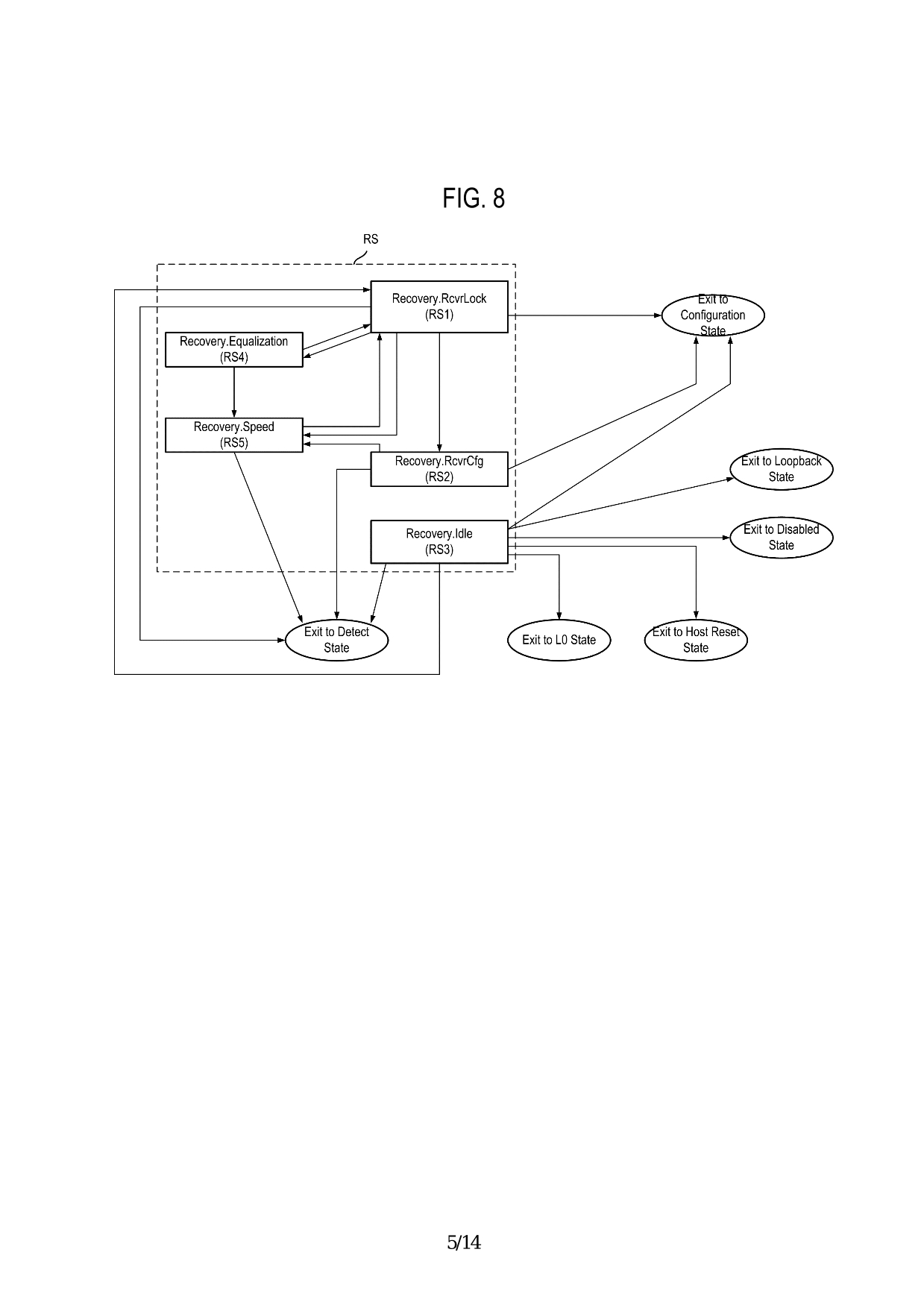 (EN) ABSTRACT A device includes a port connected to a link including one or more lanes to support communication between the device and another device; and a controller that controls the link based on a link training and status state machine (LTSSM). The port may receive two received sequences, each defined as a training sequence, through the link in a recovery state included in the LTSSM. The training sequence may include a first symbol, including a lane number or a special symbol, and a second symbol including a loopback bit. The controller may transition from the recovery state to a loopback state included in the LTSSM, based on the first symbol including the lane number and the loopback bit being set to an active logic state, for both of the two received sequences. FIG. 10 42