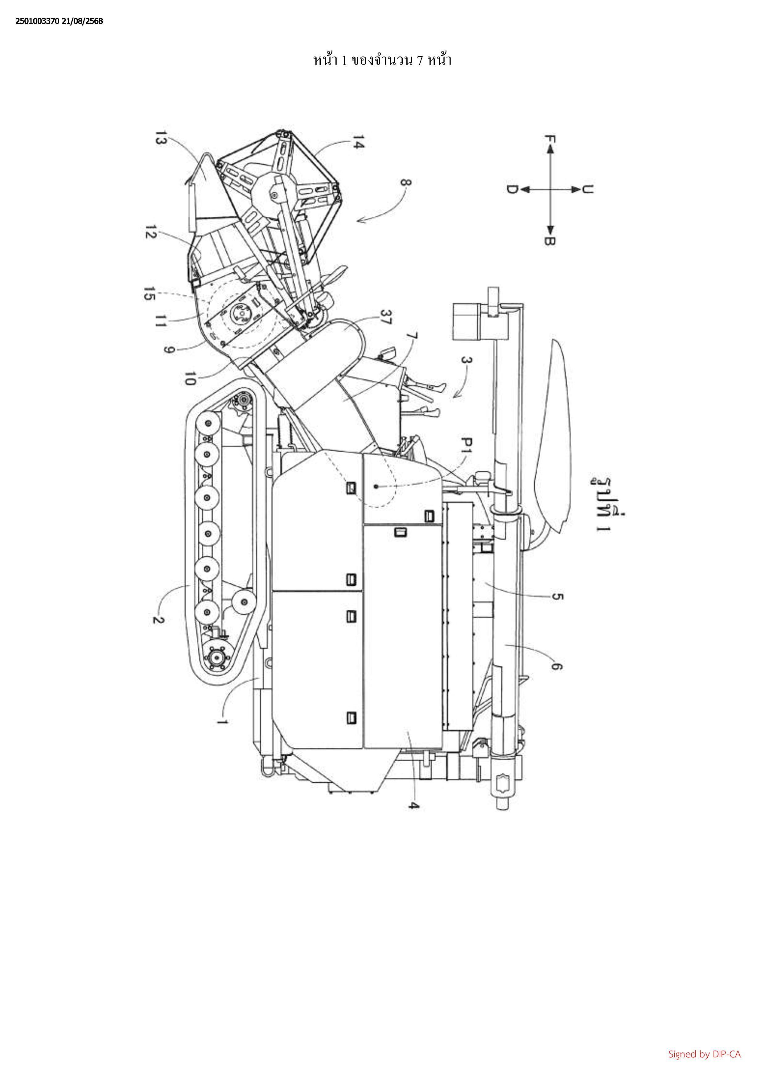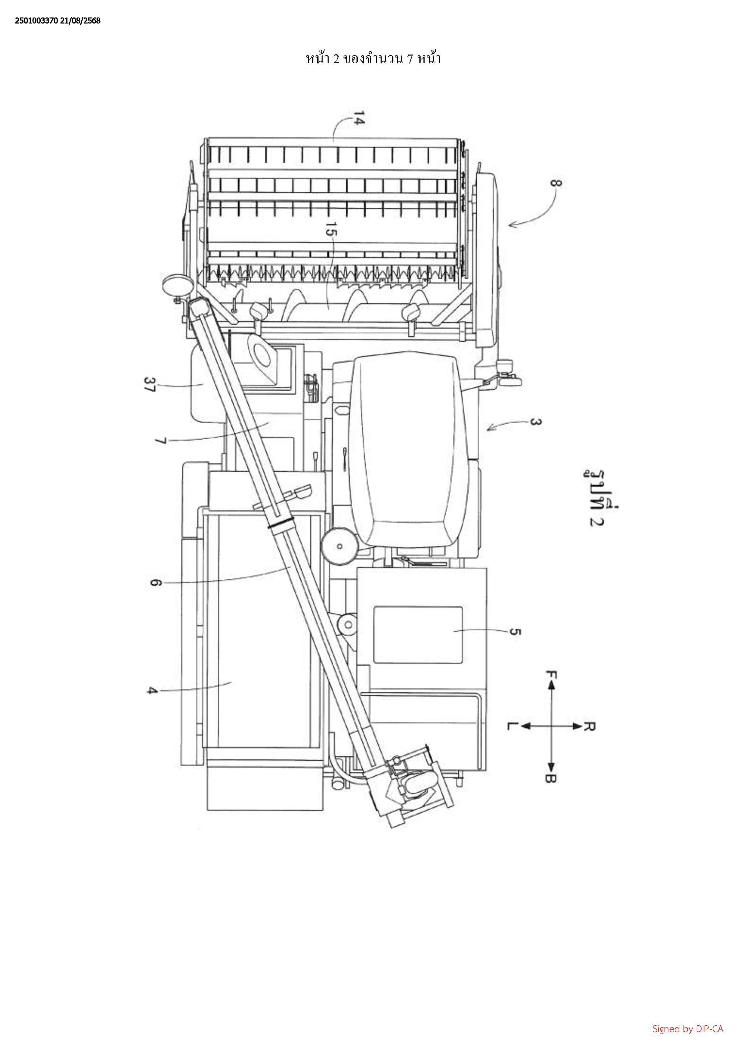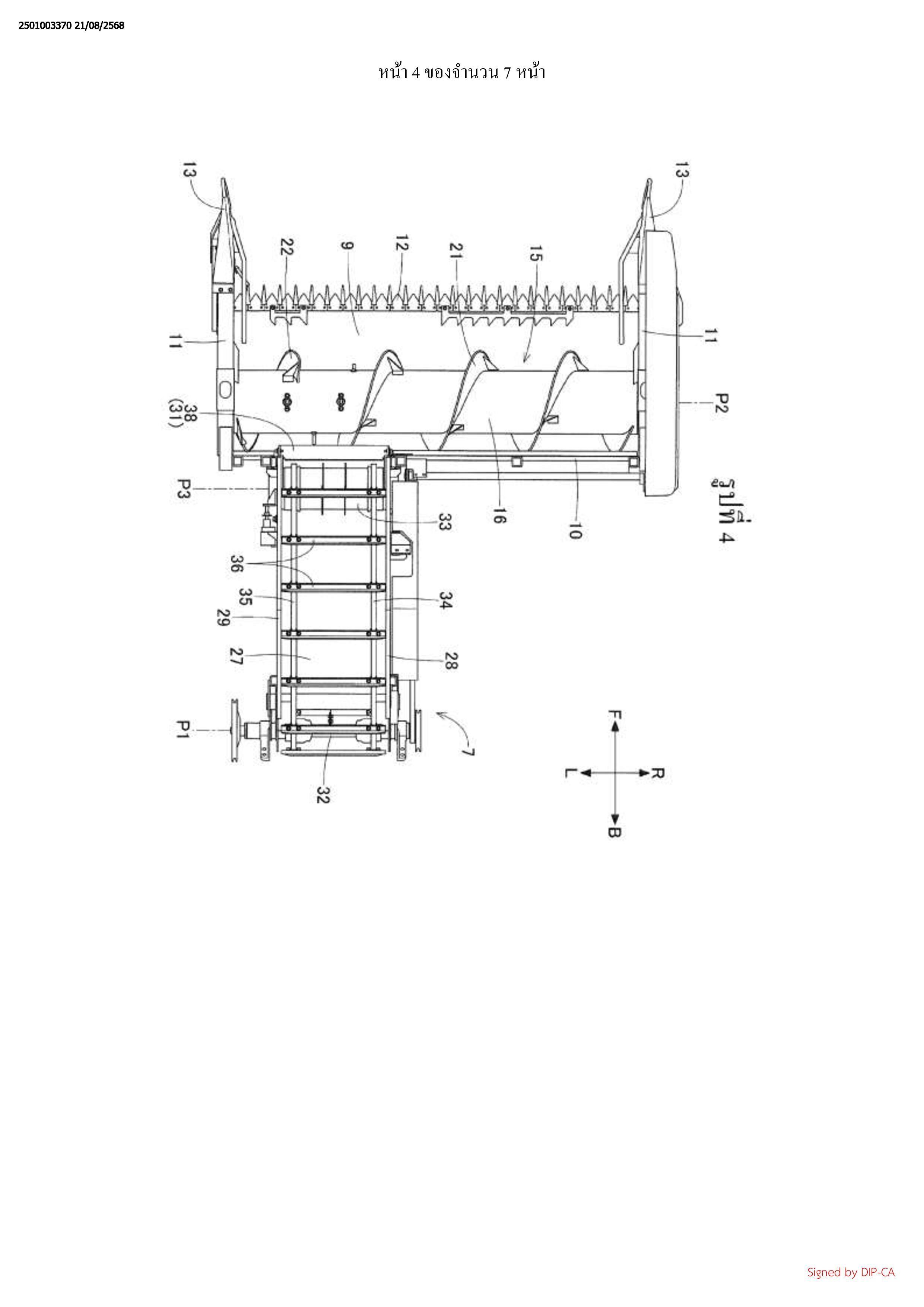 ลำเลียง เครื่องเกี่ยวนวดรวมเพิ่มเติมถึงฝาครอบ 38 ที่ถูกจัดวางข้างบนพื้นที่เปิดของส่วนทางเข้า 31