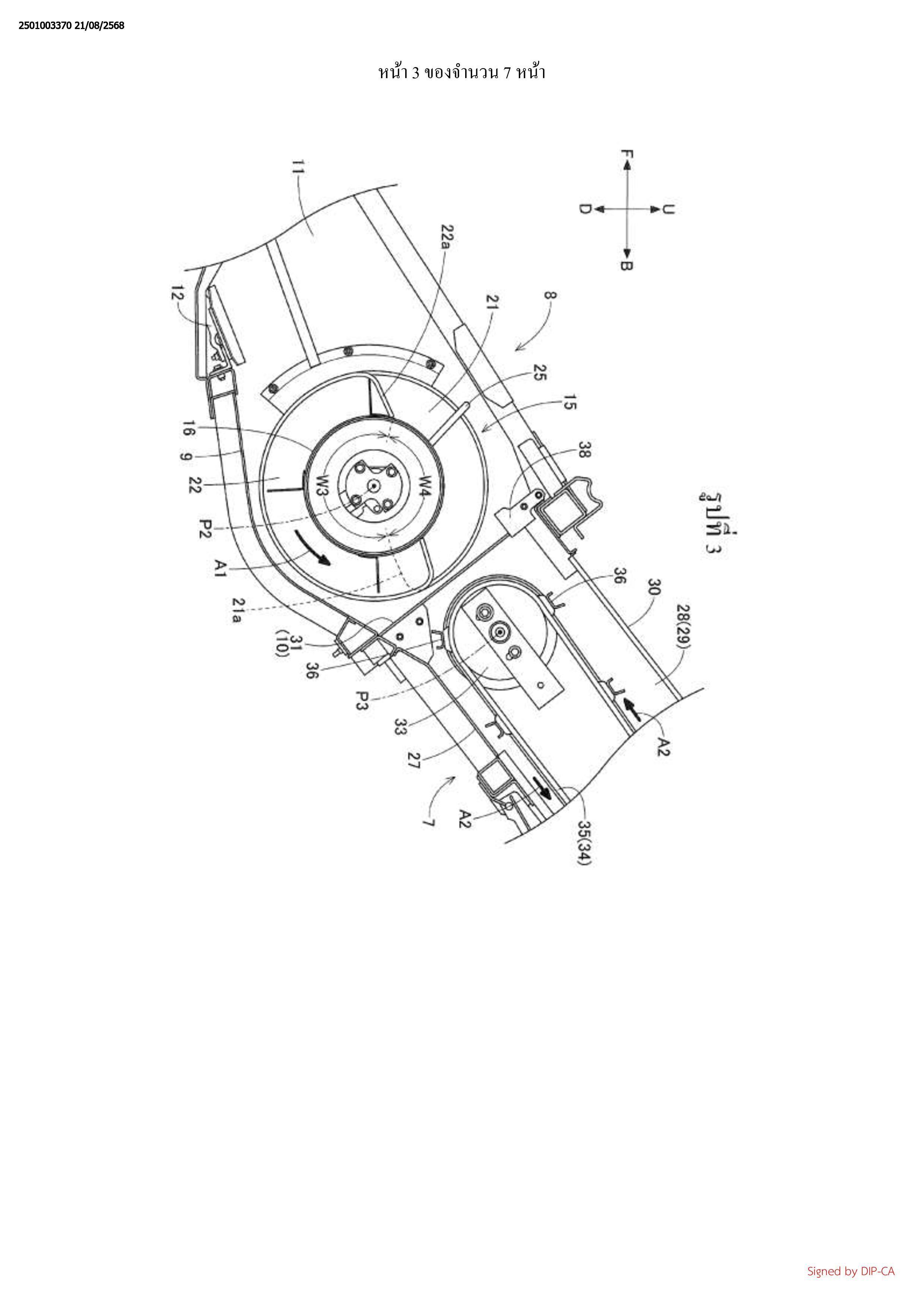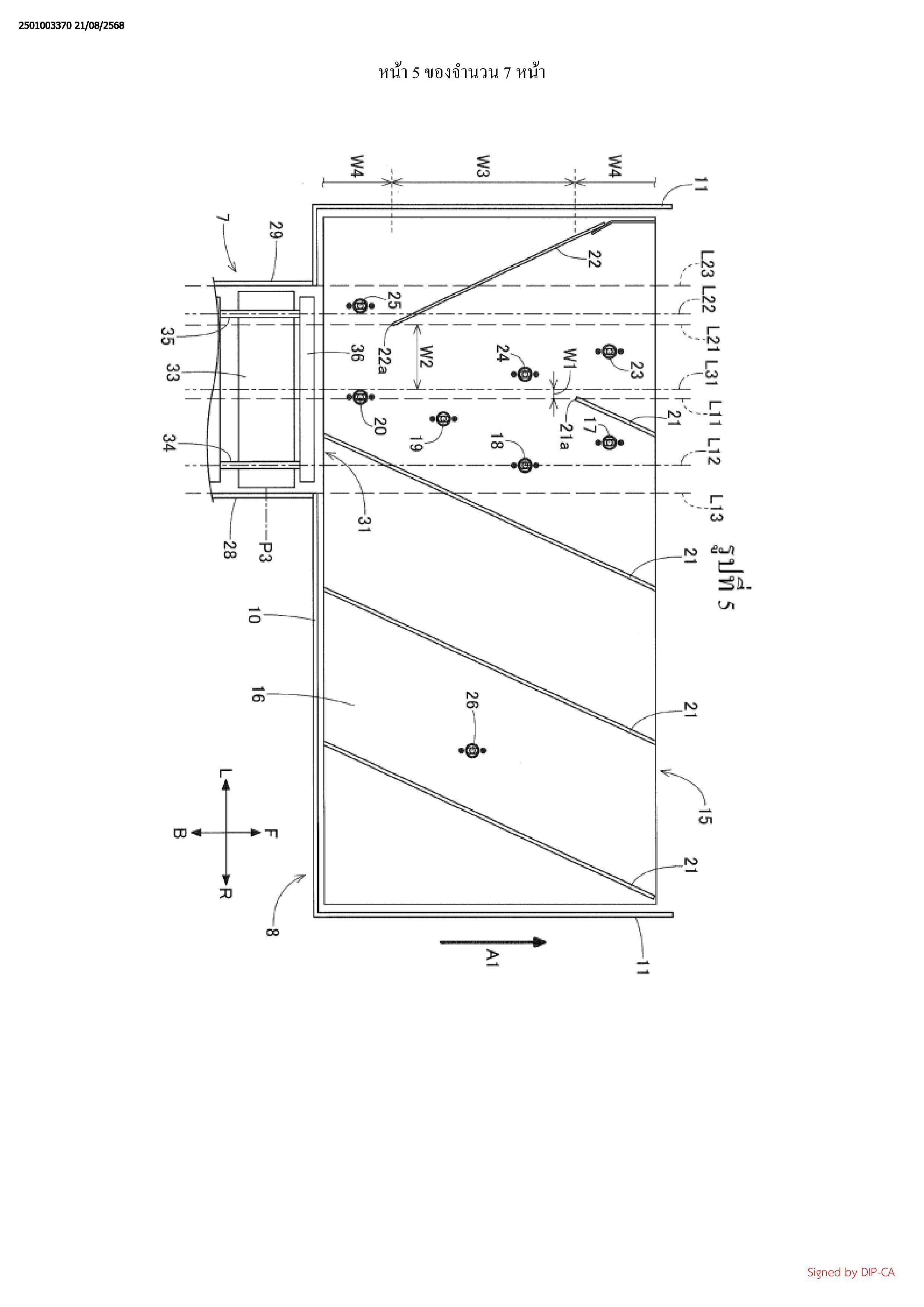 ส่วนด้านล่าง 27 ของอุปกรณ์ลำเลียง และไปทางข้างหน้าไปตามส่วนแผ่นด้านบน 30 ของอุปกรณ์
