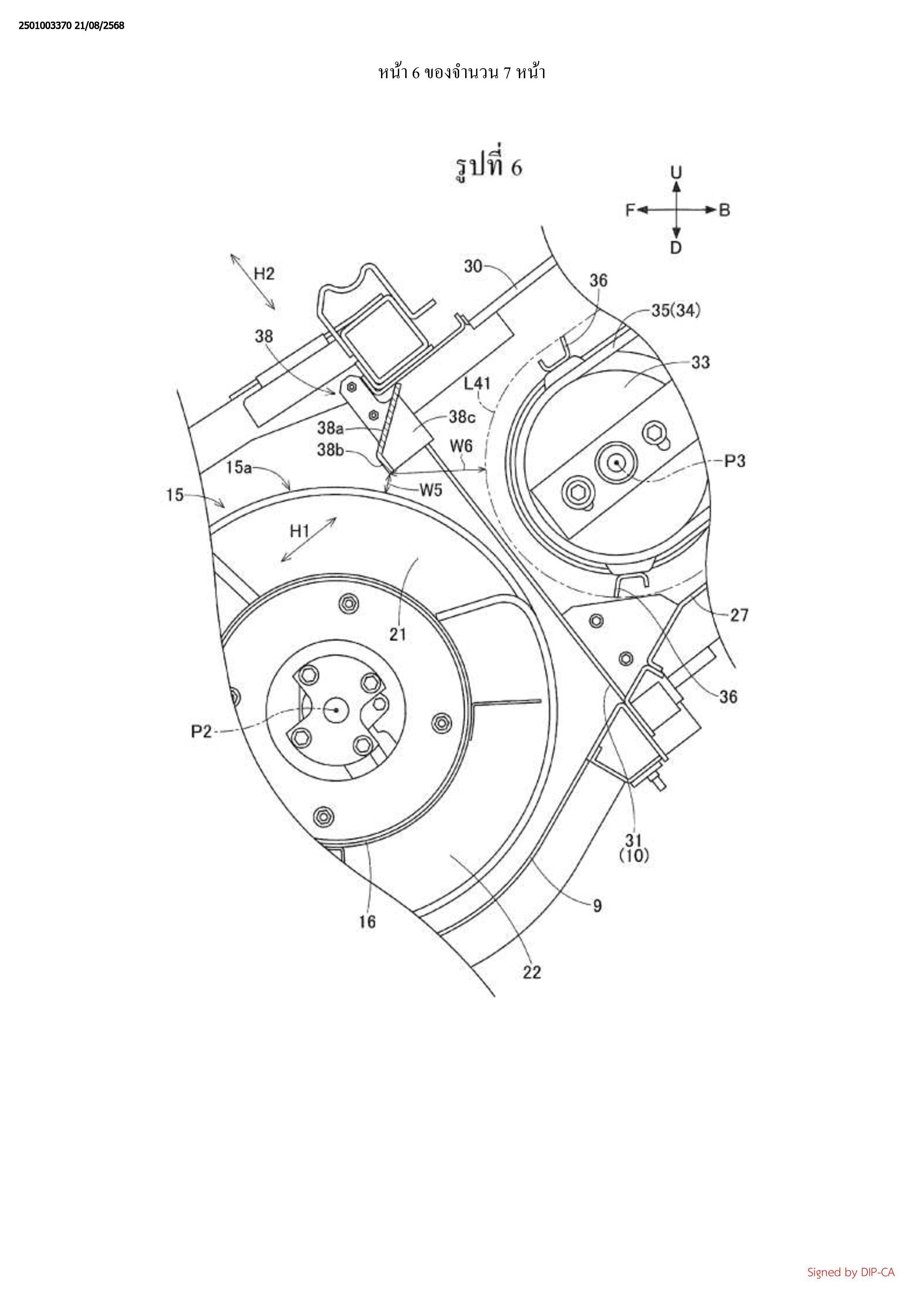 โดยรอบแกน P2 ที่ขยายออกในทิศทางซ้าย-ขวาและอุปกรณ์ลำเลียงที่มีส่วนทางเข้า 31 ที่ถูกติดกับ