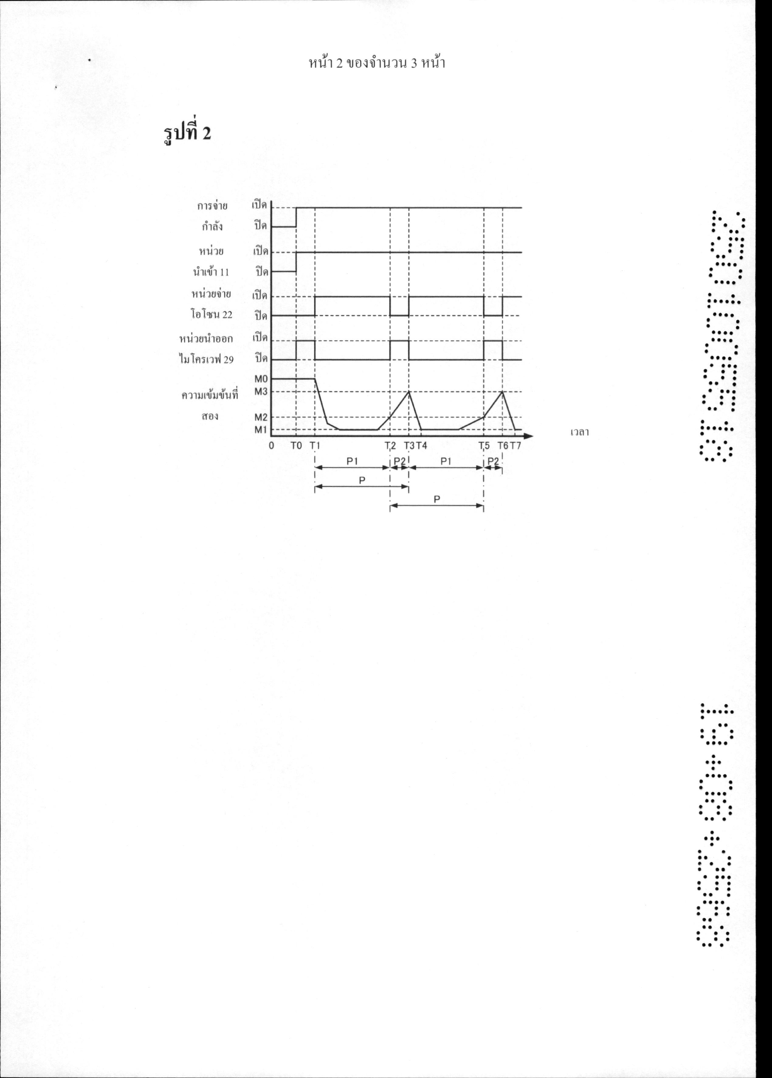 1 OCR 06WT 1. อุปกรณ์ทำให้มีเทนบริสุทธิ์ที่ประกอบรวมด้วย เส้นทางการไหลซึ่งแก๊สที่ประกอบด้วยมีเทนที่หนึ่งไหลผ่าน. หน่วยจ่ายโอโซนที่จ่ายโอโซนให้กับแก๊สที่หนึ่ง, ตัวเร่งปฏิกิริยาที่ย่อยสลายมีเทนที่อยู่ในแก๊สที่สองที่ประกอบด้วยแก๊สที่หนึ่งที่ไหลผ่าน เส้นทางการไหลและโอโซนที่ถูกจ่ายด้วยหน่วยจ่ายโอโซน และ หน่วยนำออกไมโครเวฟที่นำออกไมโครเวฟรอบตัวเร่งปฏิกิริยาในเส้นทางการไหล 2. อุปกรณ์ทำให้มีเทนบริสุทธิ์ตามข้อถือสิทธิที่ 1 ที่ประกอบรวมเพิ่มเติมด้วย แผ่นปกป้องที่หนึ่งที่ถูกจัดไว้ต้นทางของตัวเร่งปฏิกิริยาและหน่วยนำออกไมโครเวฟใน เส้นทางการไหล, รวมถึงส่วนผ่านที่หนึ่งหนึ่งส่วนหรือมากกว่านั้นซึ่งแก๊สที่สองไหลผ่าน และปิดกั้น ไมโครเวฟ และ แผ่นปกป้องที่สองที่ถูกจัดไว้ปลายทางของตัวเร่งปฏิกิริยาและหน่วยนำออกไมโครเวฟใน เส้นทางการไหล, รวมถึงส่วนผ่านที่สองหนึ่งส่วนหรือมากกว่านั้นซึ่งแก๊สที่สองไหลผ่าน และปิดกั้น ไมโครเวฟ 3. อุปกรณ์ทำให้มีเทนบริสุทธิ์ตามข้อถือสิทธิที่ 2, ที่ซึ่งแผ่นปกป้องที่หนึ่งรวมถึงส่วน ผ่านที่หนึ่งที่มีความยาวด้านข้างหรือเส้นผ่านศูนย์กลางที่เท่ากับครึ่งหนึ่งหรือน้อยกว่านั้นของความ ยาวคลื่นของไมโครเวฟที่ถูกนำออกด้วยหน่วยนำออกไมโครเวฟ และ แผ่นปกป้องที่สองรวมถึงส่วนผ่านที่สองที่มีความยาวด้านข้างหรือเส้นผ่านศูนย์กลางที่เท่ากับ หรือน้อยกว่าครึ่งหนึ่งของความยาวคลื่นของไมโครเวฟที่ถูกนำออกด้วยหน่วยนำออกไมโครเวฟ 4. อุปกรณ์ทำให้มีเทนบริสุทธิ์ตามข้อใดข้อหนึ่งในข้อถือถือสิทธิที่ 1 ถึง 3 ที่ประกอบรวม เพิ่มเติมด้วย หน่วยควบคุมการทำให้บริสุทธิ์ที่ควบคุมระยะเวลาที่หน่วยจ่ายโอโซนจ่ายโอโซนและ ระยะเวลาที่หน่วยนำออกไมโครเวฟนำออกไมโครเวฟ 5. อุปกรณ์ทำให้มีเทนบริสุทธิ์ ทำให้หน่วยนำออกไมโครเวฟนำออกไมโครเวฟทันทีหลังจากชุดอุปกรณ์ทำให้มีเทนบริสุทธิ์ถูก กระตุ้น และทำให้หน่วยจ่ายโอโซนจ่ายโอโซนหลังจากระยะเวลาที่กำหนดไว้ล่วงหน้าผ่านไปตั้งแต่ เวลาที่หน่วยนำออกไมโครเวฟเริ่มนำออกไมโครเวฟ 6. อุปกรณ์ทำให้มีแทนบริสุทธิ์ตามข้อถือถือสิทธิที่ 4 หรือ 5 ที่ประกอบรวมเพิ่มเติมด้วย หน่วยตรวจจับที่ตรวจจับความเข้มข้นที่หนึ่งของมีเทนที่อยู่ในแก๊สที่หนึ่งที่ช่องเข้าของ เส้นทางการไหลและความเข้มข้นที่สองของมีเทนที่อยู่ในแก๊สที่สองที่ไหลที่ปลายทางของตัวเร่ง ปฏิกิริยาในเส้นทางการไหล, ที่ซึ่งหน่วยควบคุมการทำให้บริสุทธิ์ทำให้หน่วยนำออกไมโครเวฟนำ ออกไมโครเวฟภายได้เงื่อนไขว่า (i) อัตราการ